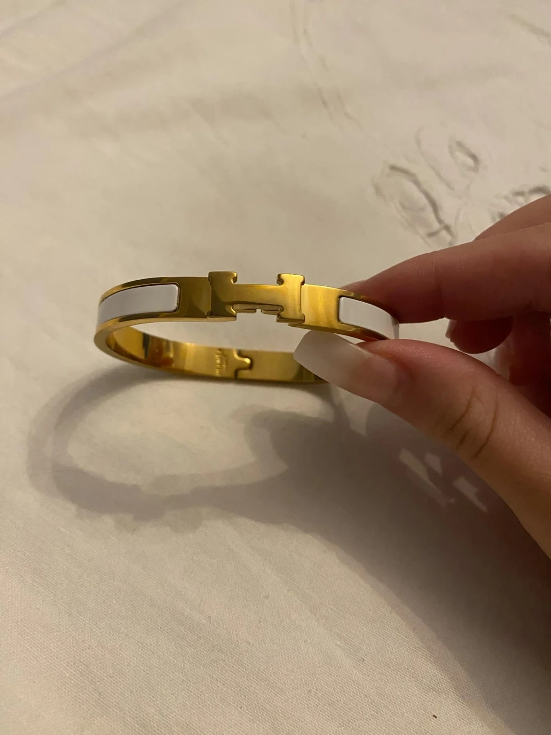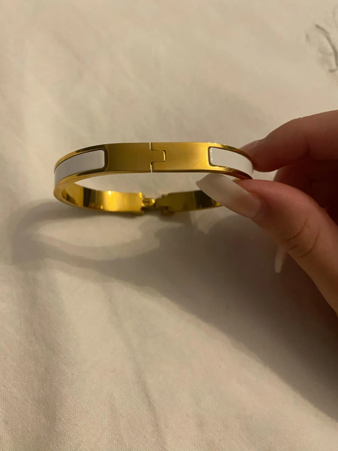 Selling a beautiful Hermès Clic H bracelet in gold with white enamel detailing! It's in great condition and the perfect accessory to add a touch of luxury to any outfit. Classic and timeless!