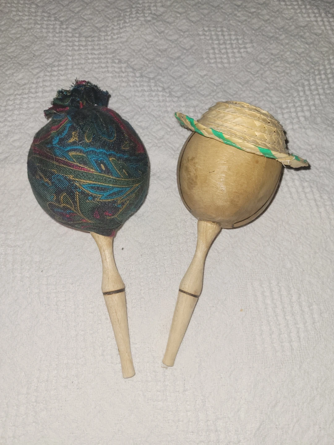 Add a touch of Cuban rhythm to your collection with these charming vintage maracas! This pair features hand-painted faces, one with a jaunty hat and the other with a stylish headscarf. These maracas are used but are in great condition, perfect for display or a fun musical accent. Time to shake things up! Since these maracas are ready to find a new home, if the ad's still up, they're still available!