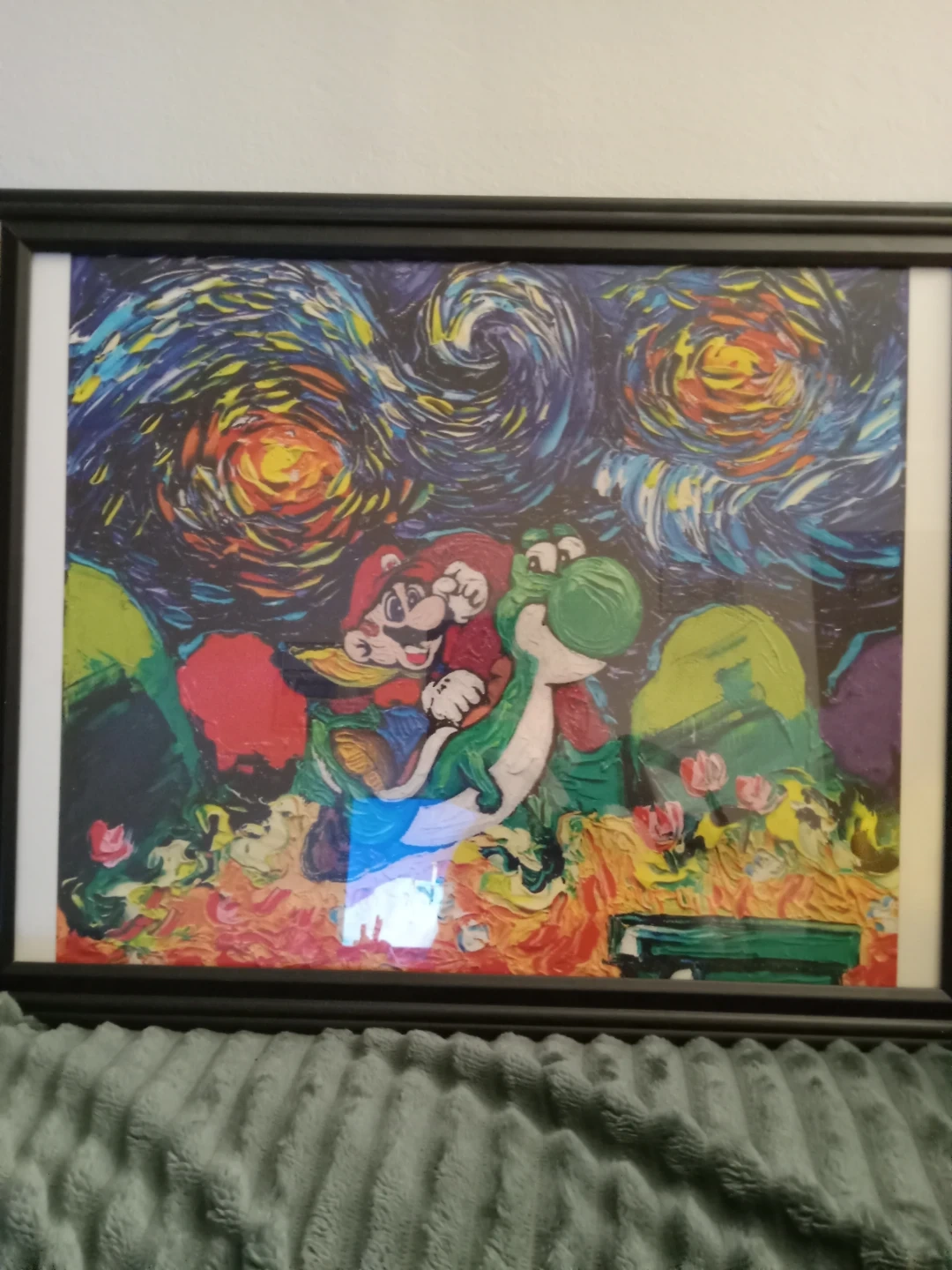 10Selling a framed print that combines Super Mario Bros. with Van Gogh's Starry Night! One frame has a small chip on the corner. They're $20 per piece or $100 for the lot of 6. Pick up