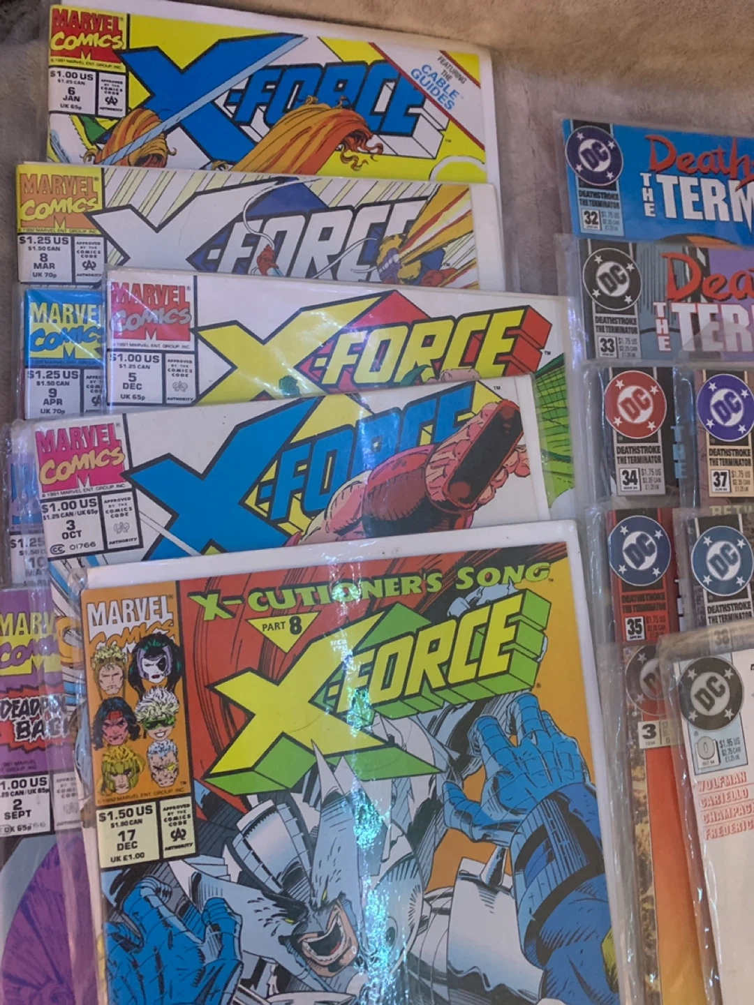 Selling a collection of Marvel and DC comic books! Includes X-Force and Deathstroke The Terminator issues. Great for collectors or anyone looking to start a comic book hobby (msg for details they’re all great condition and idk anything about them)