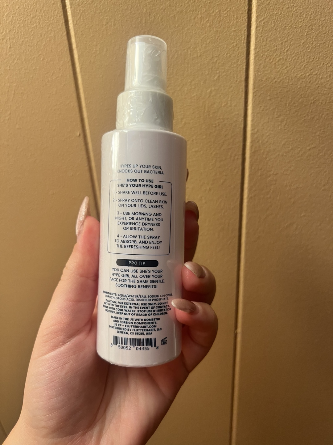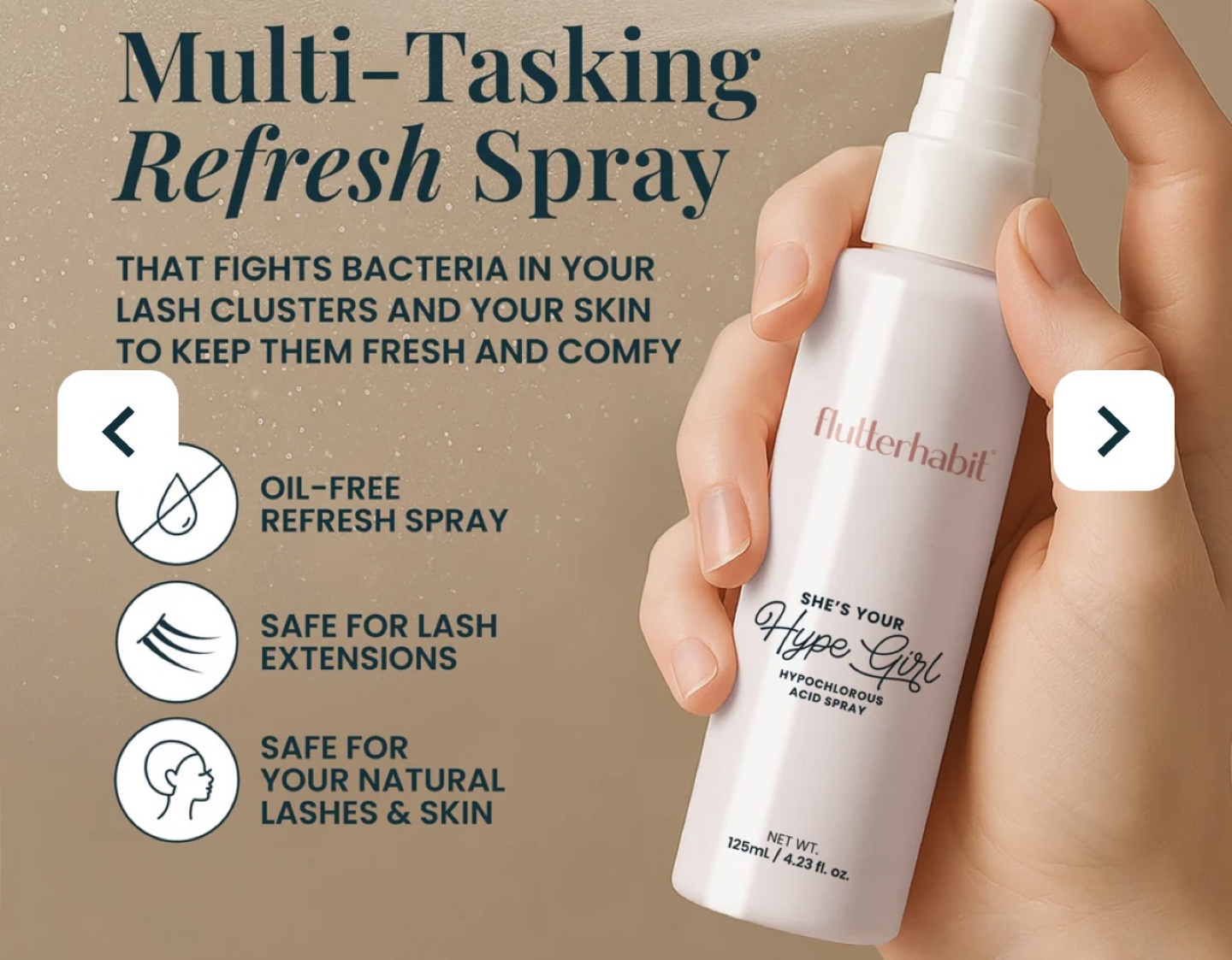 Selling a brand new Flutterhabit She's Your Hype Girl Hypochlorous Acid Spray! This oil-free and lash-safe spray is perfect for post-lash application, midday pick-me-ups, and post-workout refreshes. It's also safe for lash extensions, as well as natural lashes and skin. The bottle contains 125ml of product