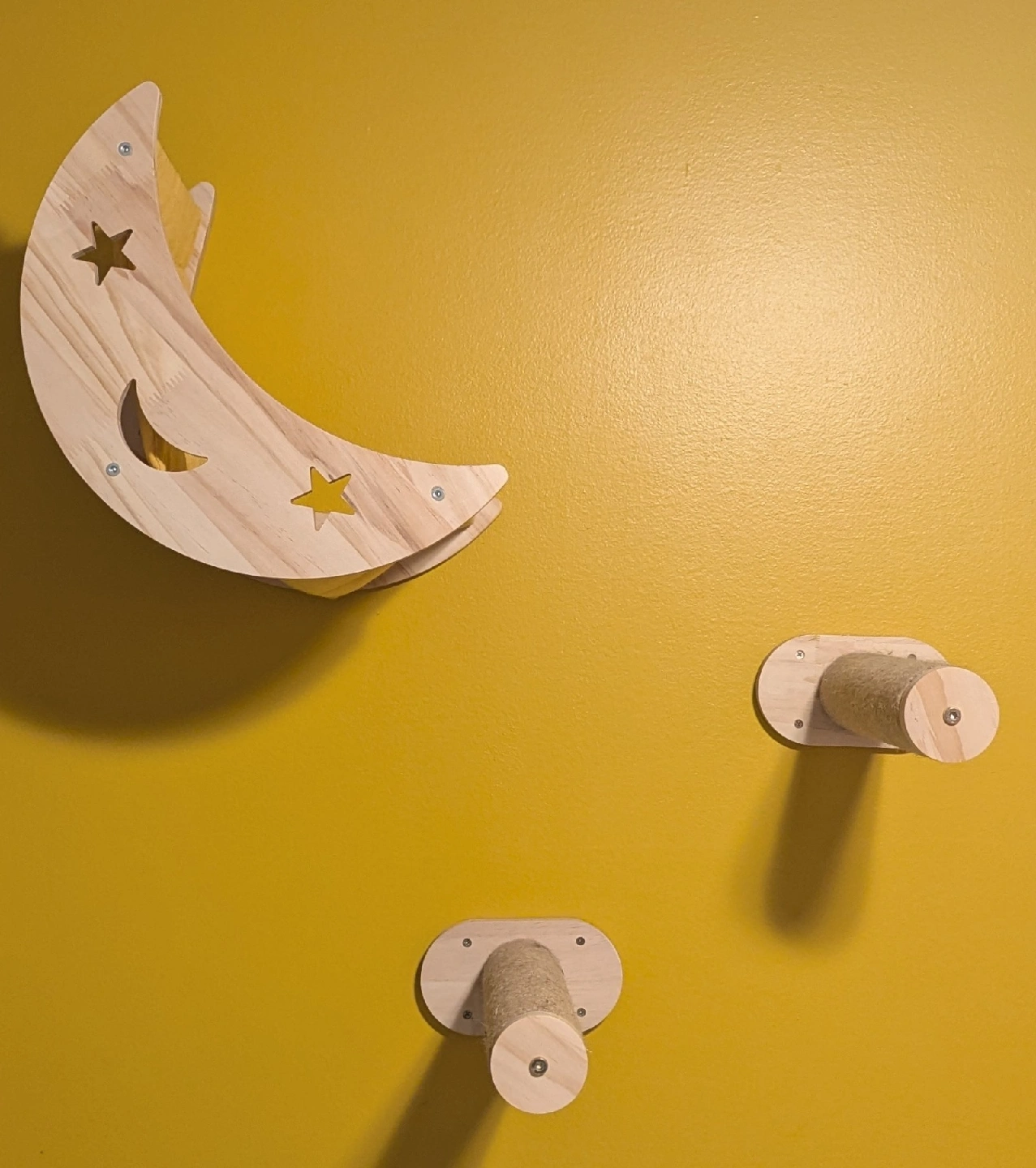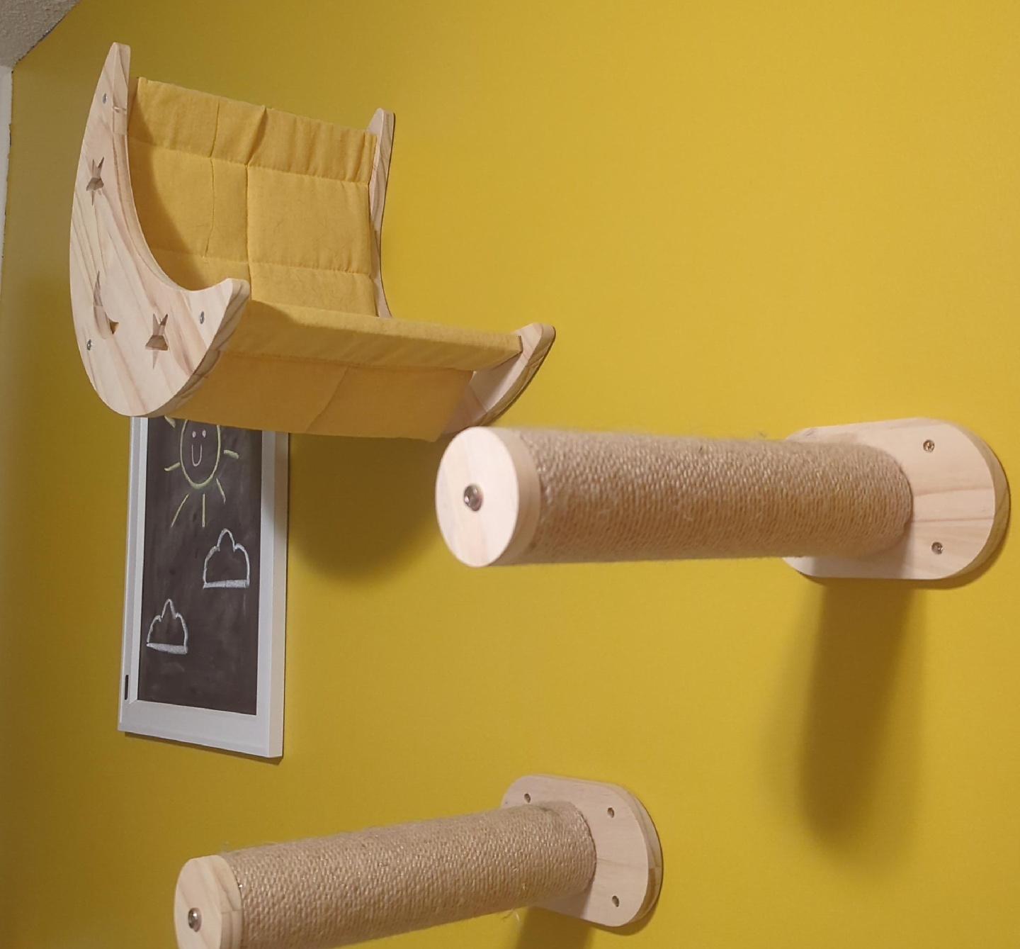 Selling a cute wooden cat wall furniture set! It includes a moon-shaped perch and two scratching posts. Perfect for giving your kitty a fun and engaging space to play and relax. The set is in great condition and ready to be mounted!
