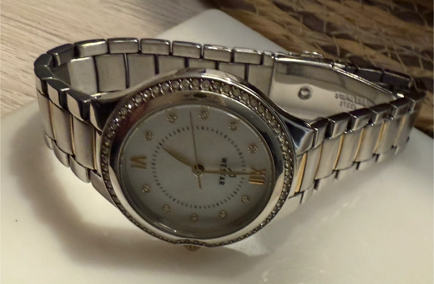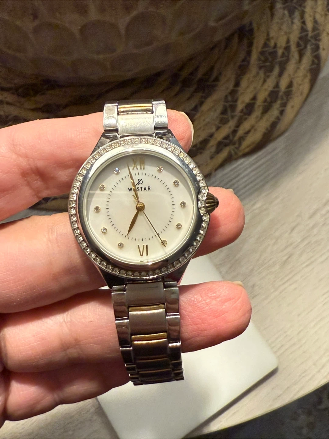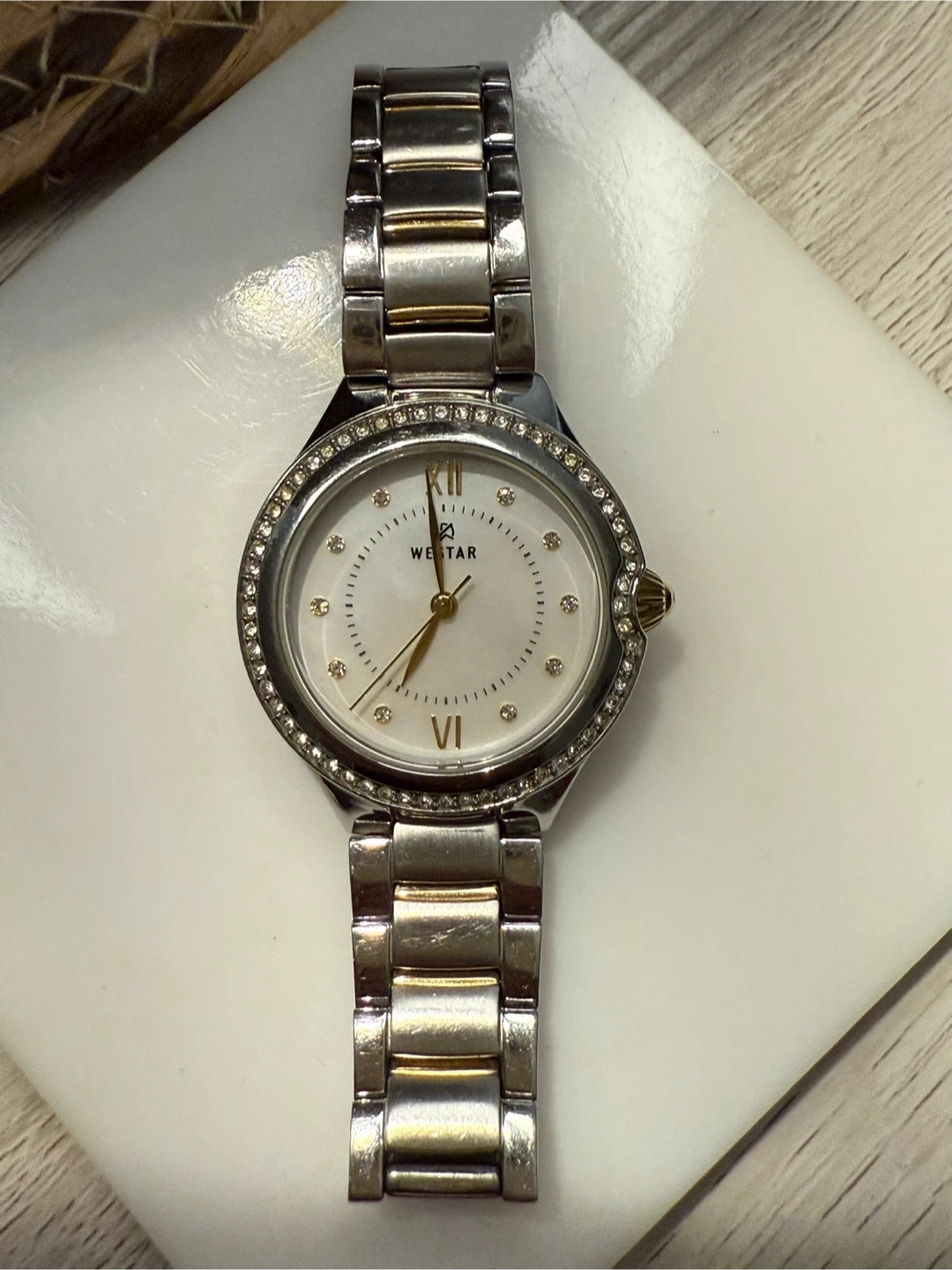 Selling a lovely Westar ladies' dress watch! It features a two-tone silver and gold band and a crystal-studded bezel. The face has Roman numerals and subtle crystal accents. It's a stylish timepiece for any occasion