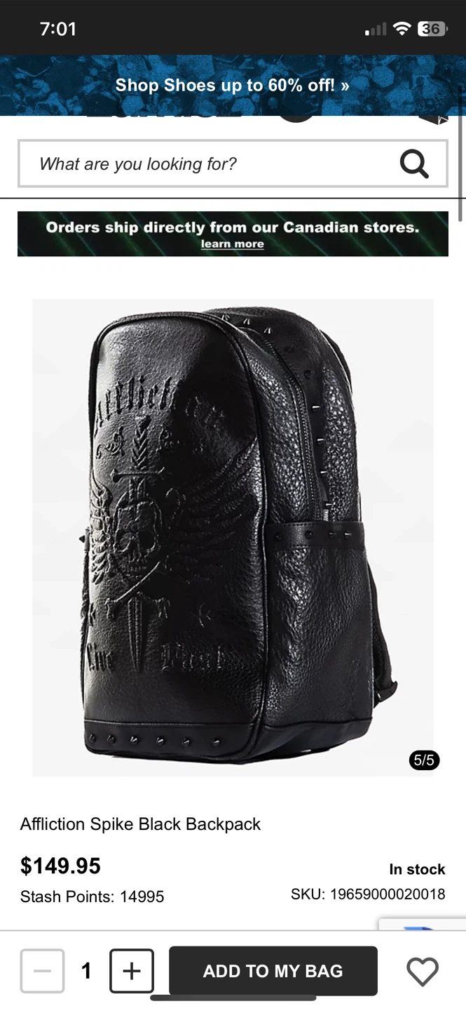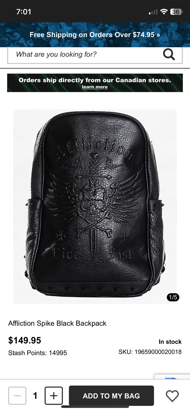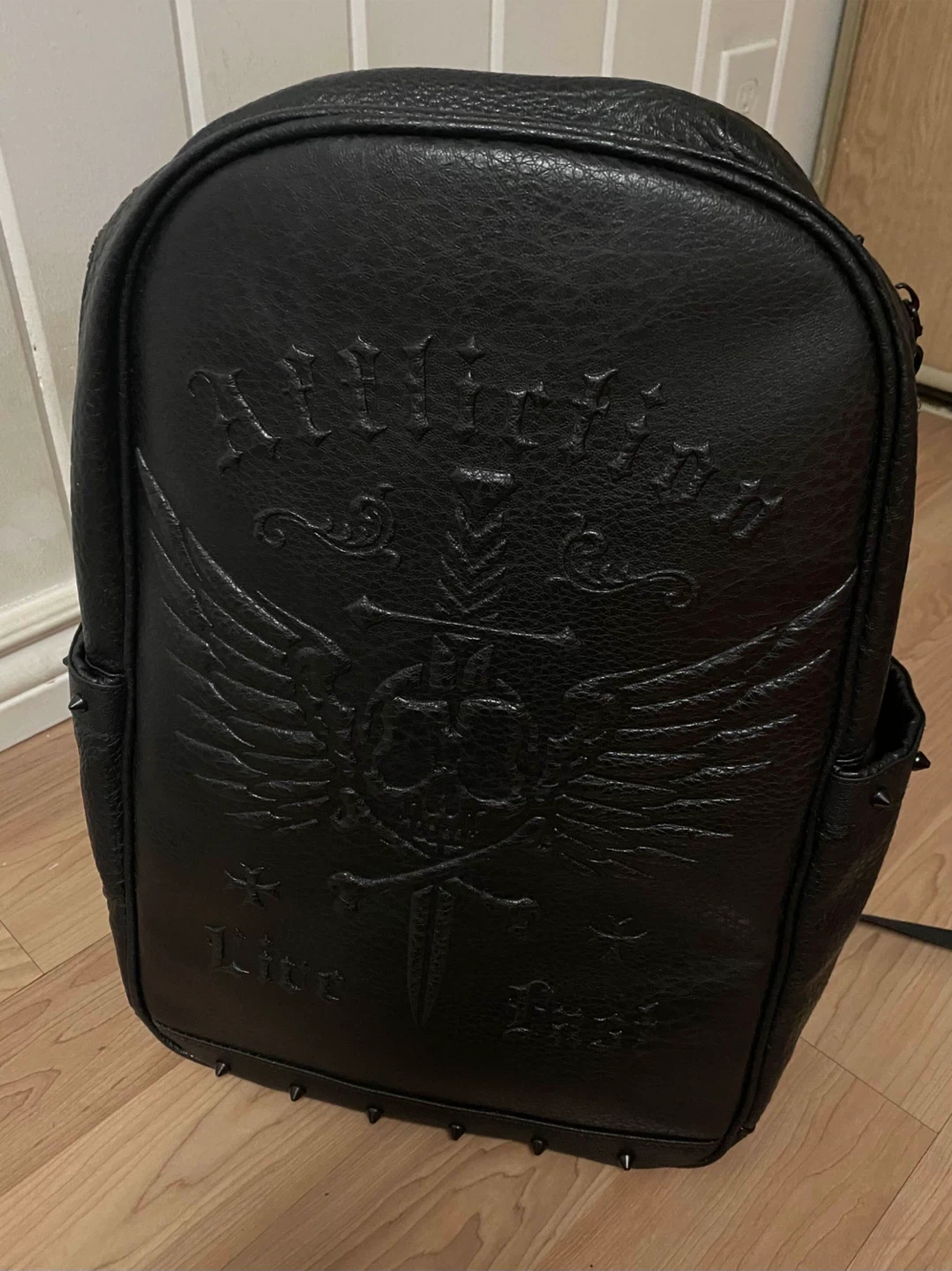 Selling an Affliction Spike black backpack. It features a cool skull and wings design, along with some edgy spike detailing. Originally bought for $150