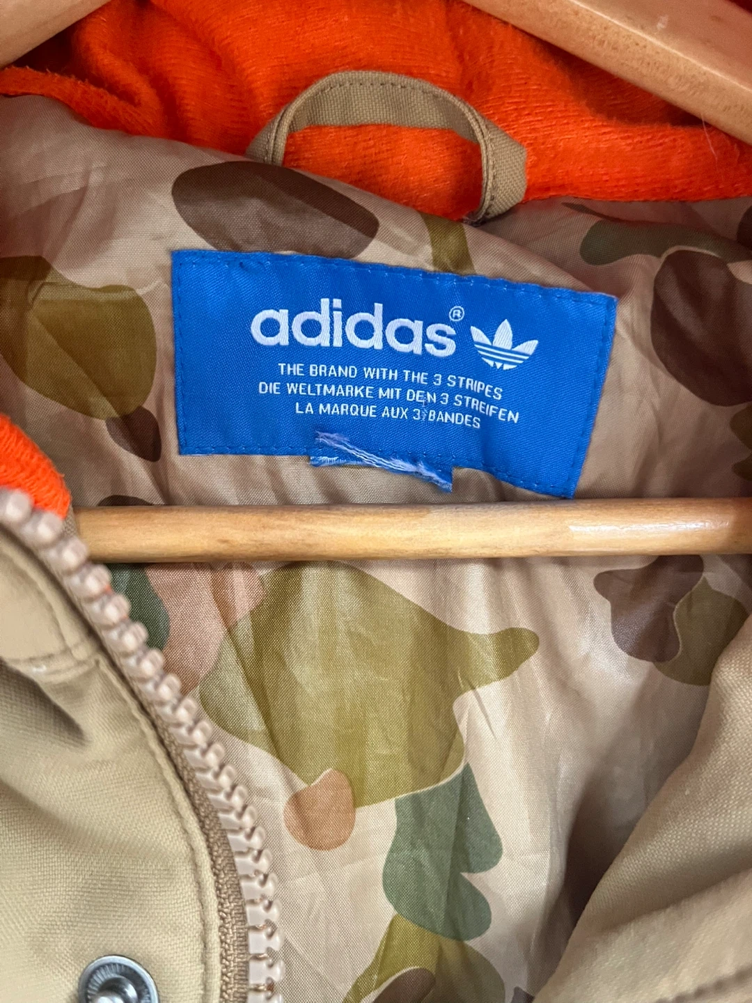 Adidas down parka featuring a detachable faux fur hood trim and an orange Trefoil logo on the chest.