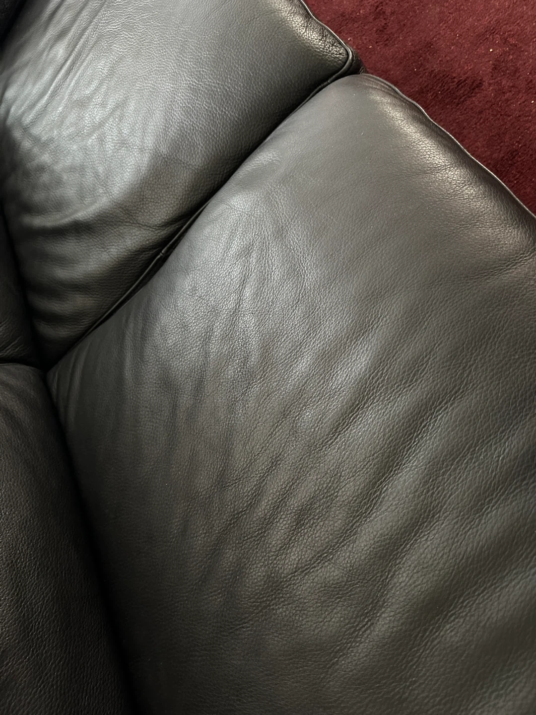 Selling a stylish black leather sofa along with a matching lounge chair. Both pieces are in good condition and would be a great addition to any living space. The leather has a nice texture and the sofa is quite comfortable for lounging!