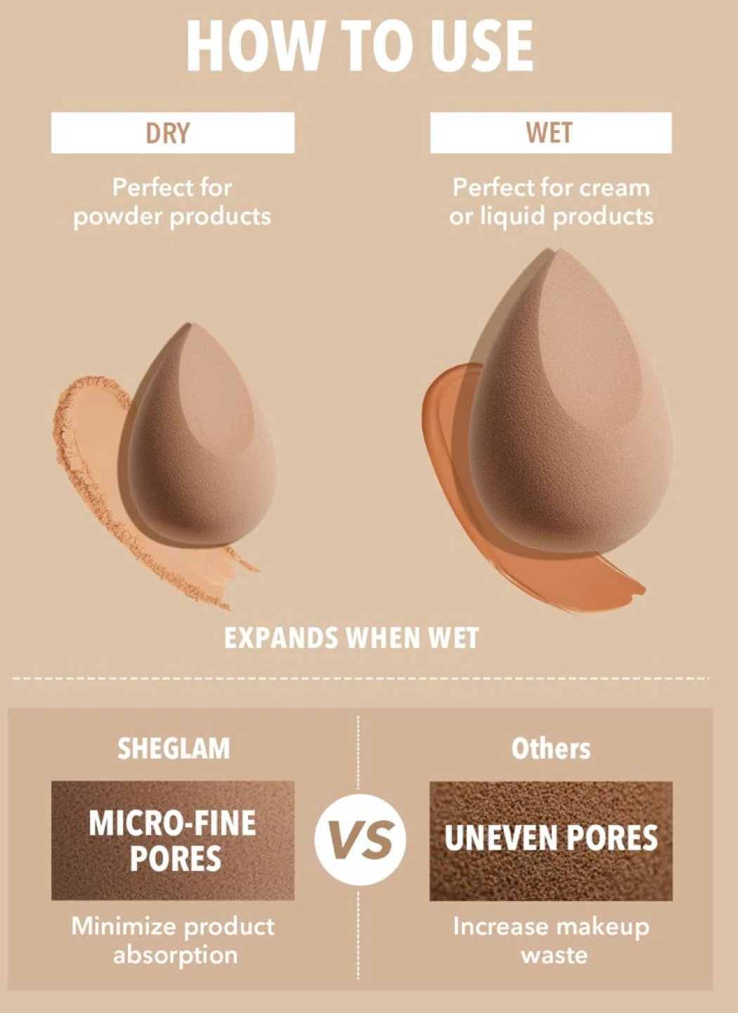 This SHEGLAM makeup sponge is perfect for applying both powder and liquid products! It expands when wet, and features micro-fine pores to minimize product absorption. The precision tip fits into tiny corners to cover blemishes, while the flat edge is great for concealing and contouring around the eyes and nose. The rounded side is ideal for blending large areas with a dabbing motion