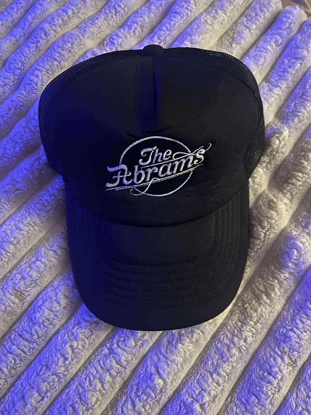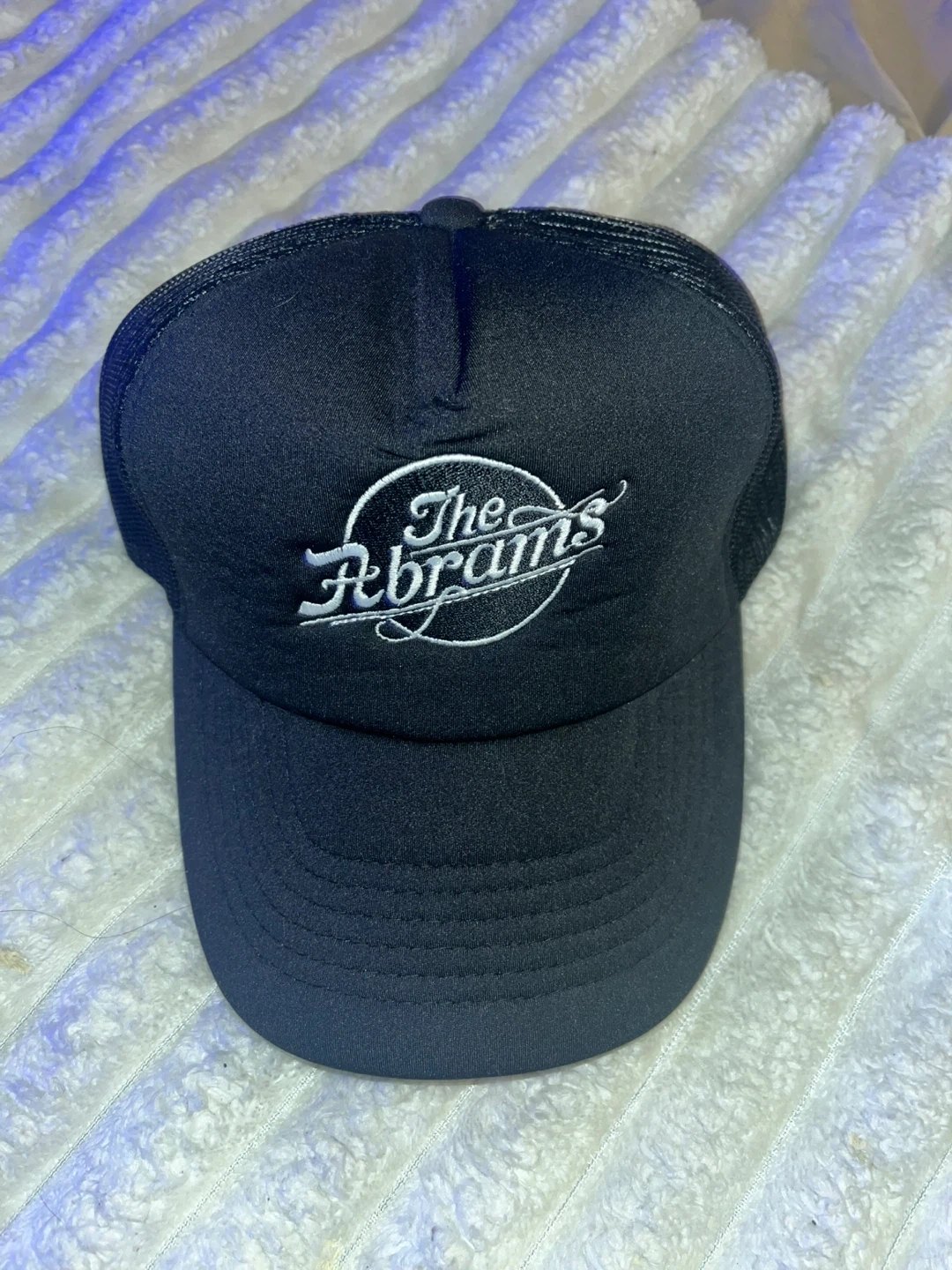 101Selling a black trucker hat with "The Abrams" logo embroidered on the front. It's in great condition and has an adjustable snapback closure for a comfortable fit.