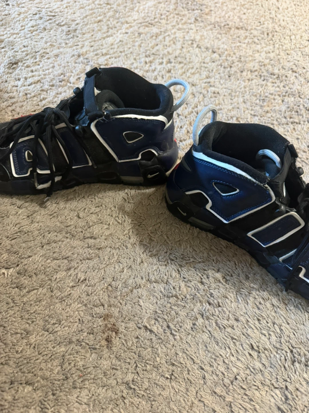 Selling a pair of Nike Air More Uptempo in size 6.5Y. The shoes are black with red and white accents. They have the iconic 'AIR' lettering on the sides. Great for basketball or casual wear!
