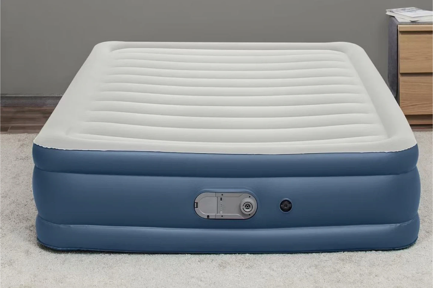 Selling an Intex air mattress Queen in great condition! It features a blue base and a white top. Perfect for guests or camping trips