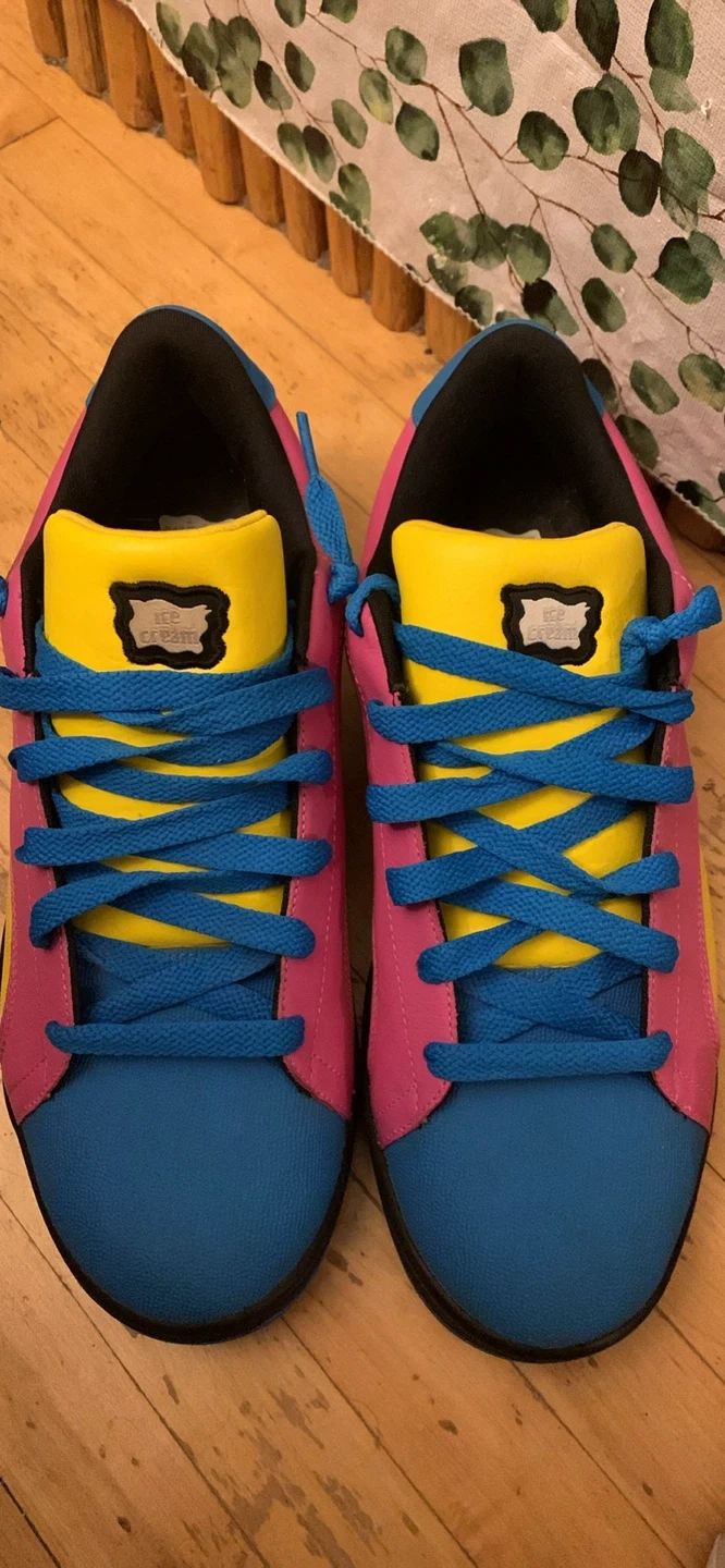 Size 13 Ice Cream skate sneakers are in great condition! They feature a fun colour block design with pink, blue, and yellow.
