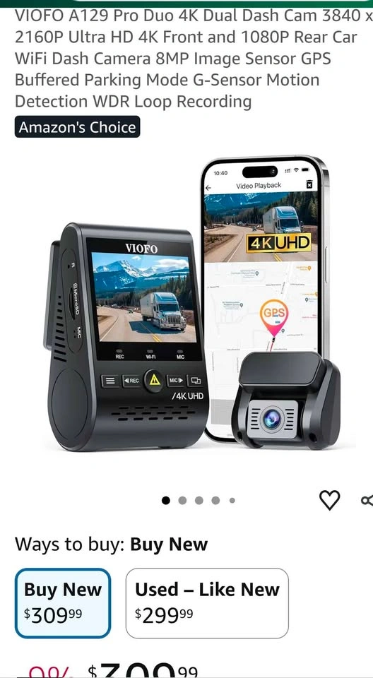 70NEW VIOFO A129 Pro Duo 4K Dual Dash Cam 3840 x 2160P Ultra HD 4K Front and 1080P Rear Car WiFi Dash Camera 8MP Image Sensor GPS Buffered Parking Mode G-Sensor Motion Detection WDR Loop Recording. PRICE IS FIRM.