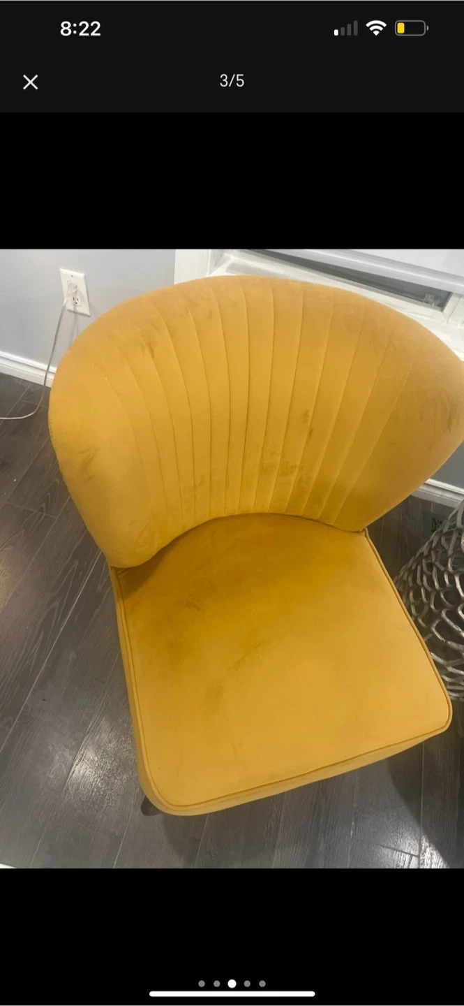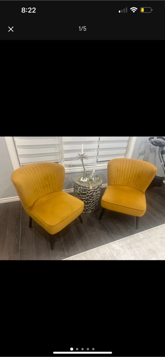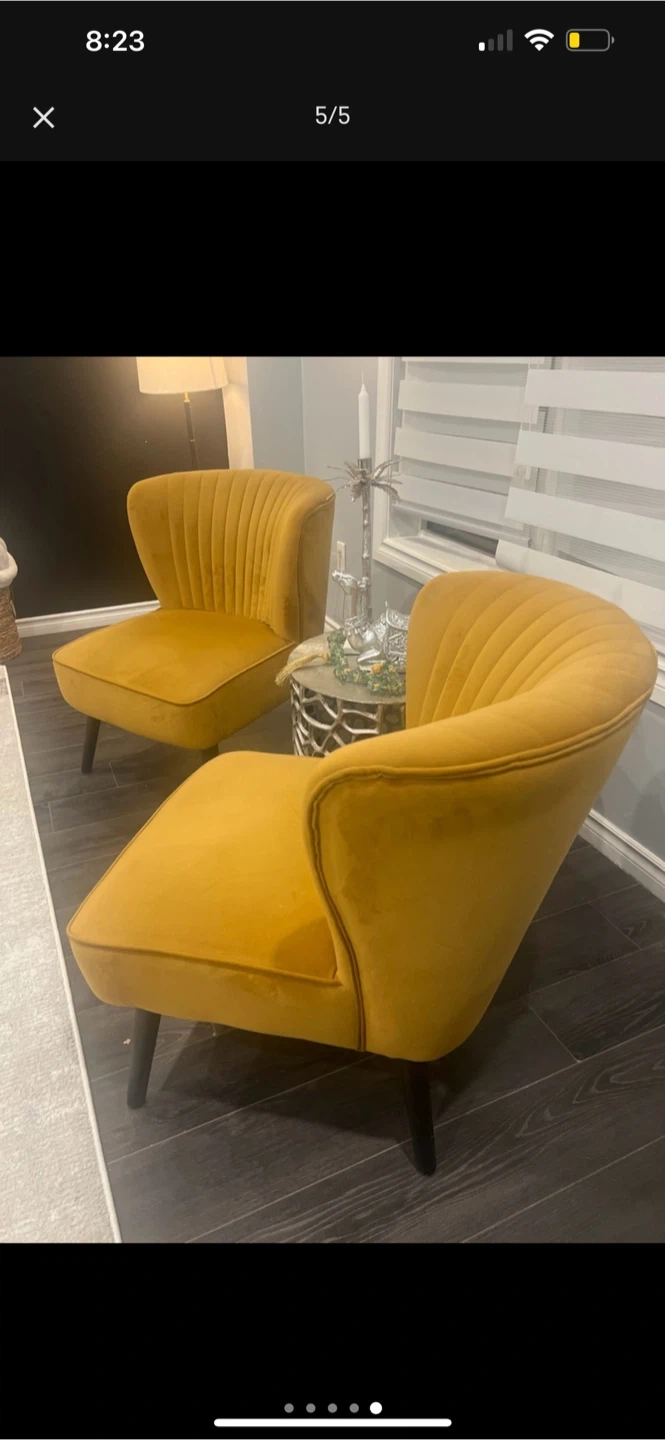Selling a set of two accent chairs! They're a beautiful mustard yellow colour and would look great in any living space. $250 for both! Amazing price!