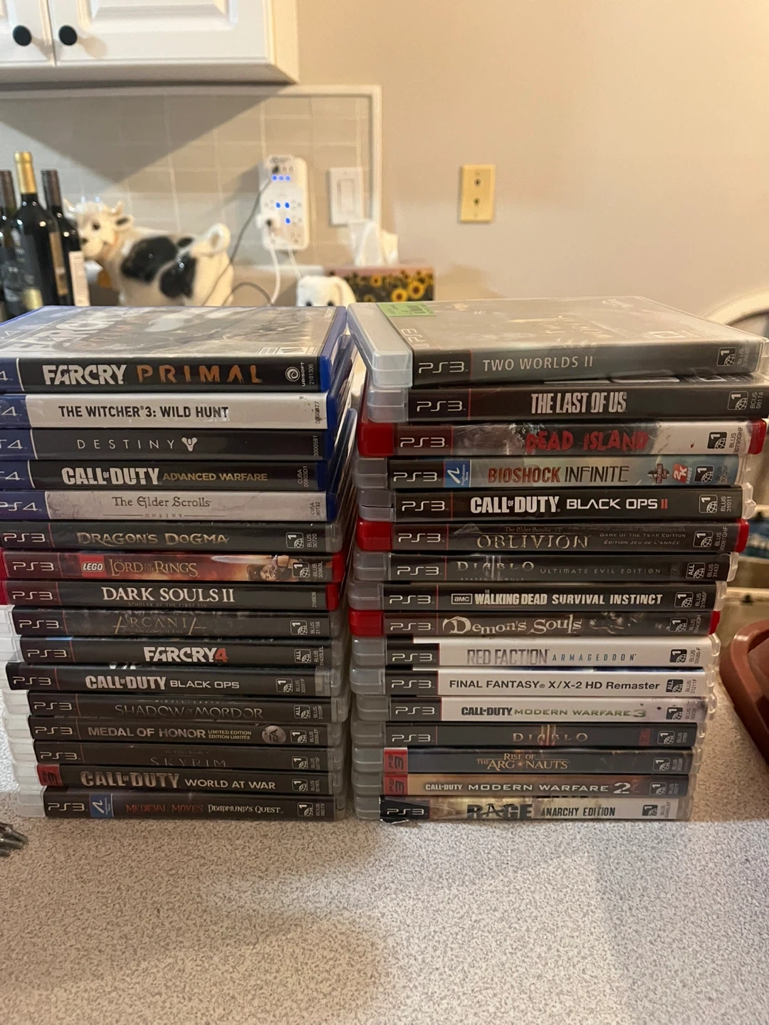 Selling a collection of PS3 and PS4 games! Titles include Far Cry Primal, The Witcher 3: Wild Hunt, Destiny, Call of Duty: Advanced Warfare, The Elder Scrolls, Dragon's Dogma, Lego Lord of the Rings, Dark Souls II, Far Cry 4, Call of Duty Black Ops, Shadow of Mordor, Medal of Honor, Skyrim, Call of Duty World at War, Two Worlds II, The Last of Us, Bioshock Infinite, Call of Duty Black Ops II, Oblivion, Diablo, Walking Dead Survival Instinct, Demon's Souls, Red Faction Armageddon, Final Fantasy X/X-2 HD Remaster, Call of Duty Modern Warfare 3, Rise of the Argonauts, Call of Duty Modern Warfare 2, and Rage Anarchy Edition