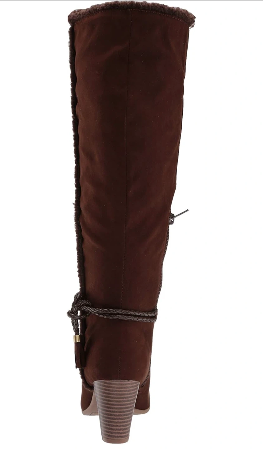 I'm selling a pair of brown knee-high boots. They feature a stylish braid detail and a comfortable heel. Perfect for adding a touch of chic to your fall or winter outfits!