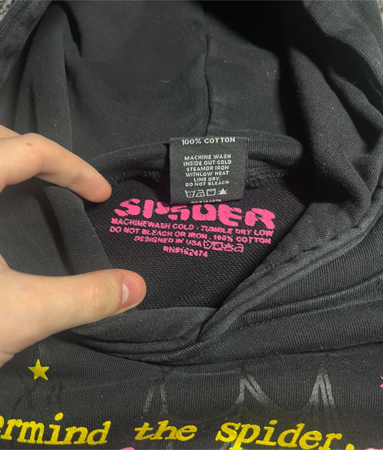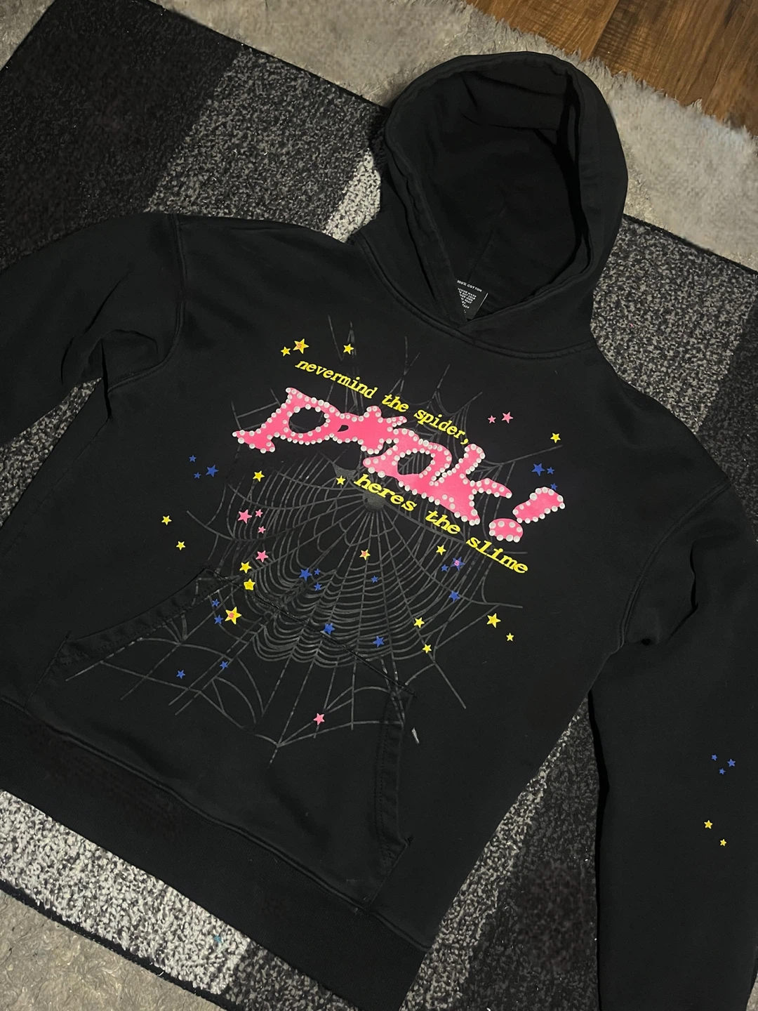 Selling a SP5DER hoodie in black, size medium. It's made of 100% cotton and has a cool design on the front!