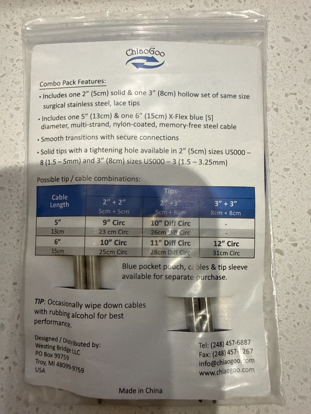 Selling a ChiaoGoo Twist Shortie Combo Pack, size US 6 (4 mm). This set includes 2" & 3" (5 & 8 cm) tips and X-Flex blue cables. The combo pack features surgical stainless steel, lace tips, and memory-free steel cable. Originally bought for $43.00