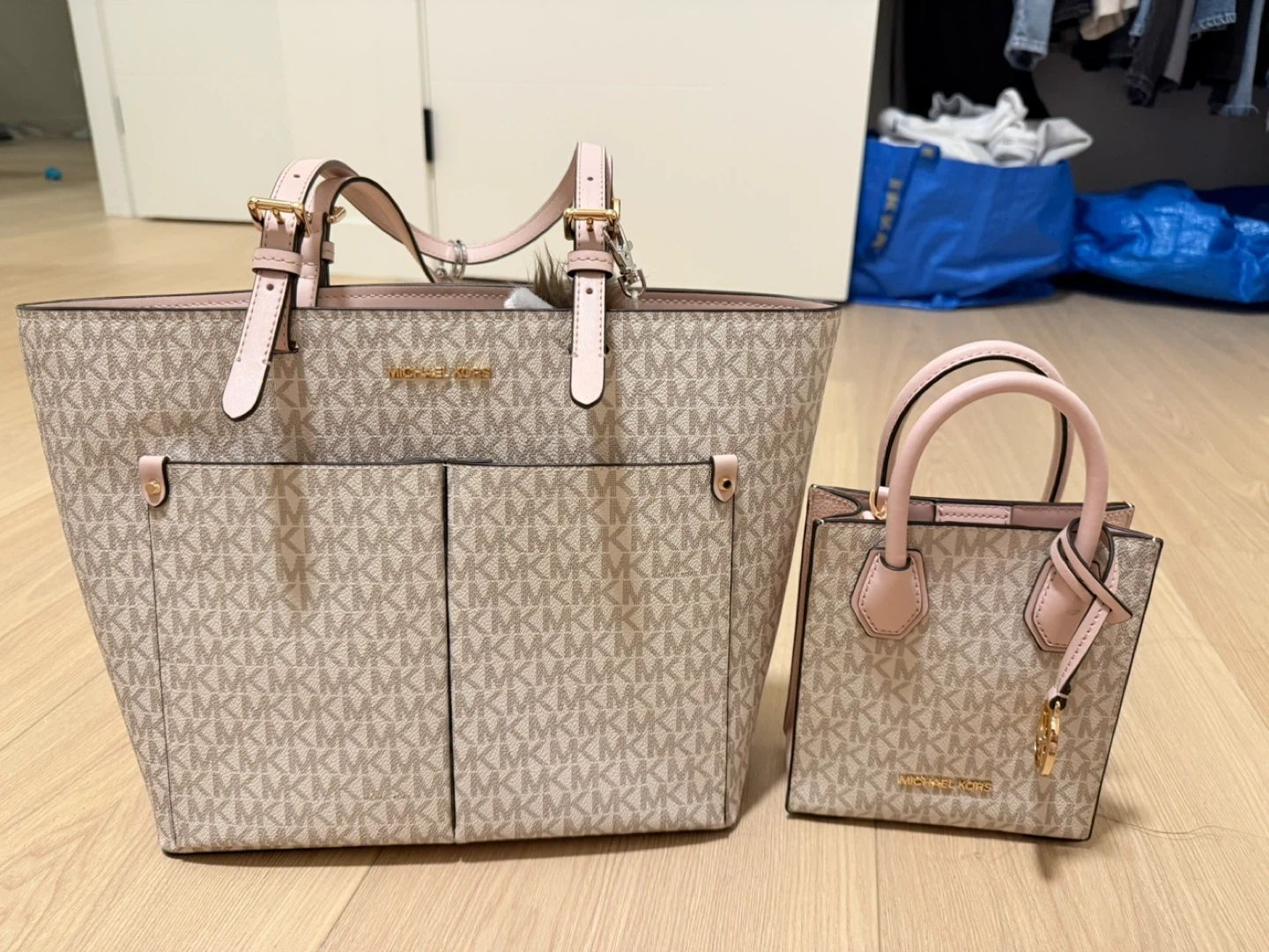 Selling a cute Michael Kors tote bag with a matching mini bag! Both are in great condition and have the classic MK logo pattern with pink accents. Perfect for everyday use or a stylish outing
