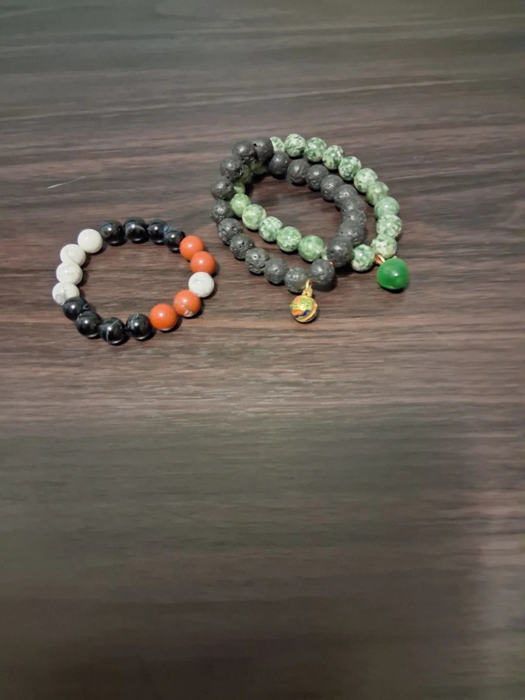 Here's a set of 2 handmade gemstone bracelets! 1 is made from Magnesite, Red Jasper, and Black Agate. The other 1 looks like 2 bracelets, it kinda is it's a 2 in 1 as they are attached. That one is Basalt and Tree Agate.