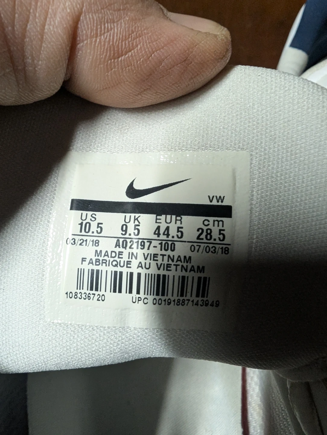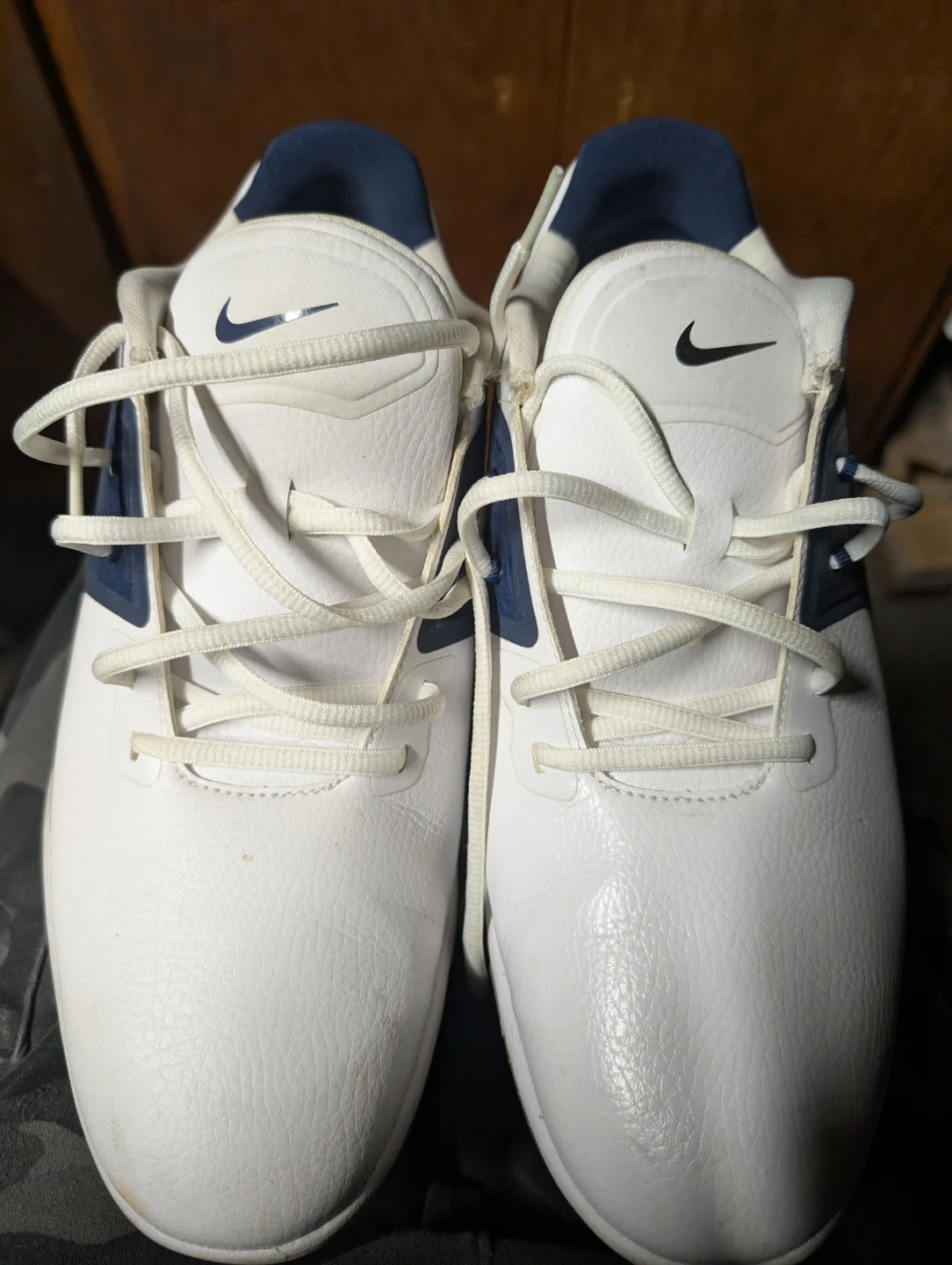 Selling a pair of Nike golf shoes in size US 10.5. They are white with navy accents and feature the Nike swoosh logo. The soles have golf cleats for traction on the course. Used once