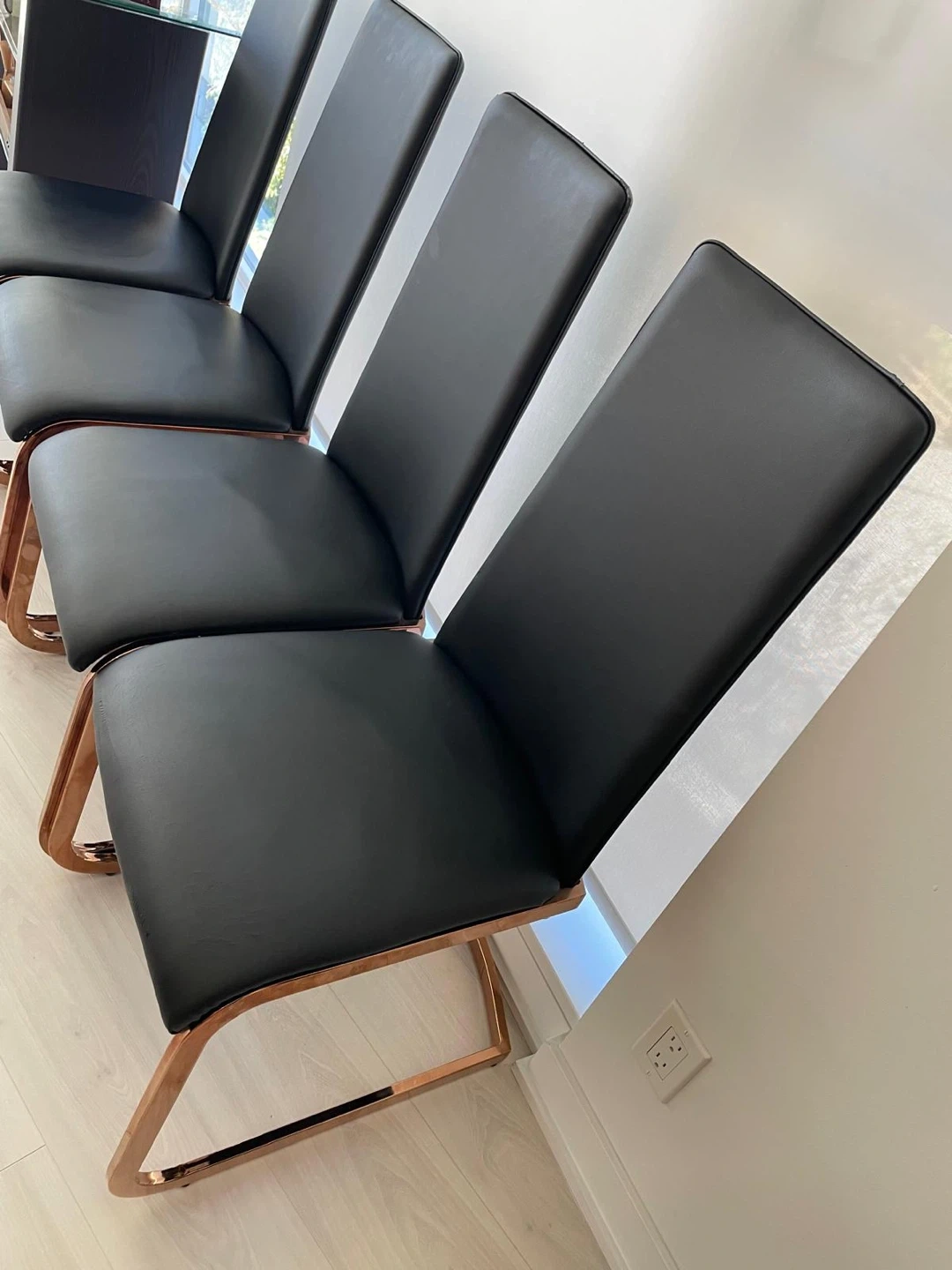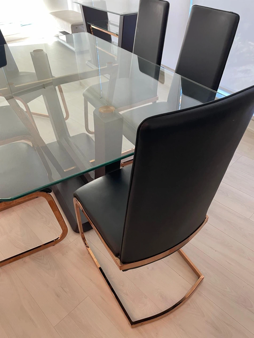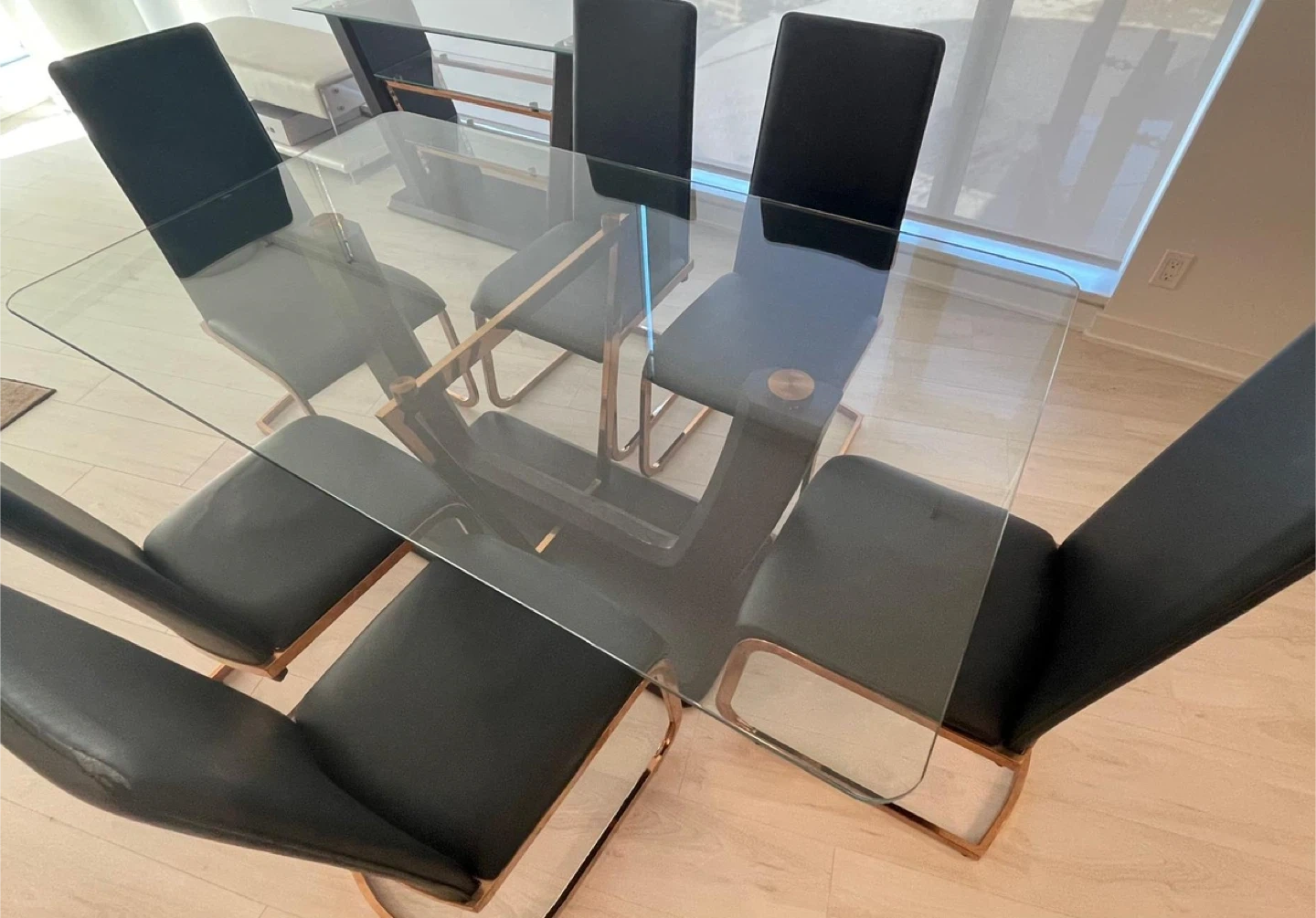 Selling a glass top dining table complete with six stylish black chairs. The table features a sleek design with a glass surface and a sturdy base. The chairs are upholstered in black, offering a comfortable seating experience. Perfect for any dining room!