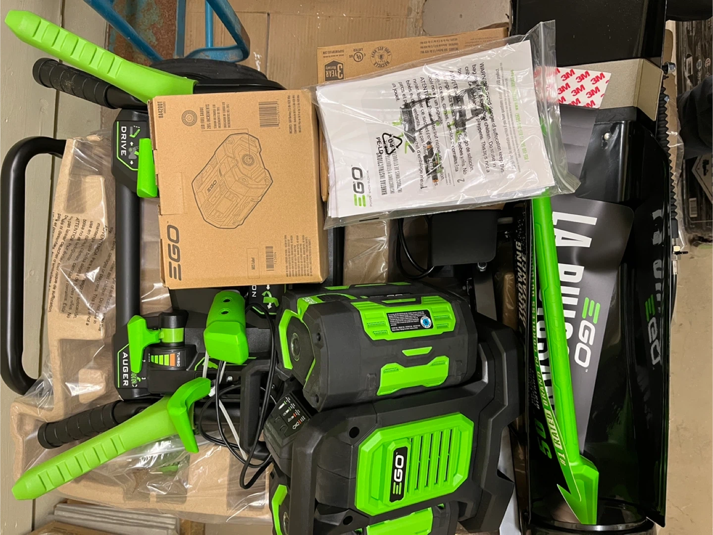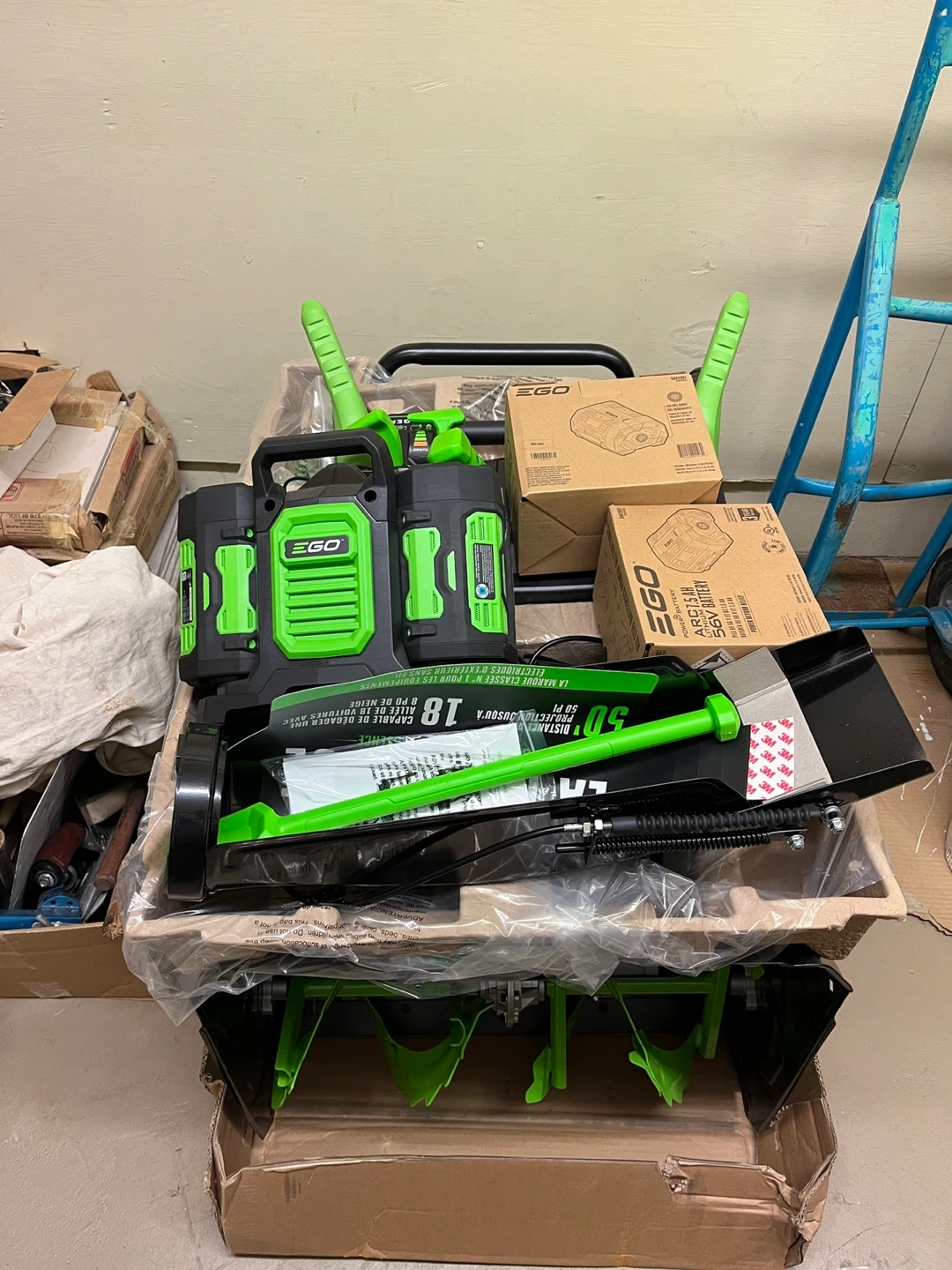 Selling a brand new EGO 56V 24" Two-Stage Snow Blower! Paid $2,000 for this and have receipt. It's still in its original packaging and has never been used. This self-propelled snow blower has a 24-inch clearing width and can handle up to 50 feet of directional throwing distance. Perfect for clearing a 10-car driveway. Get ready for winter!