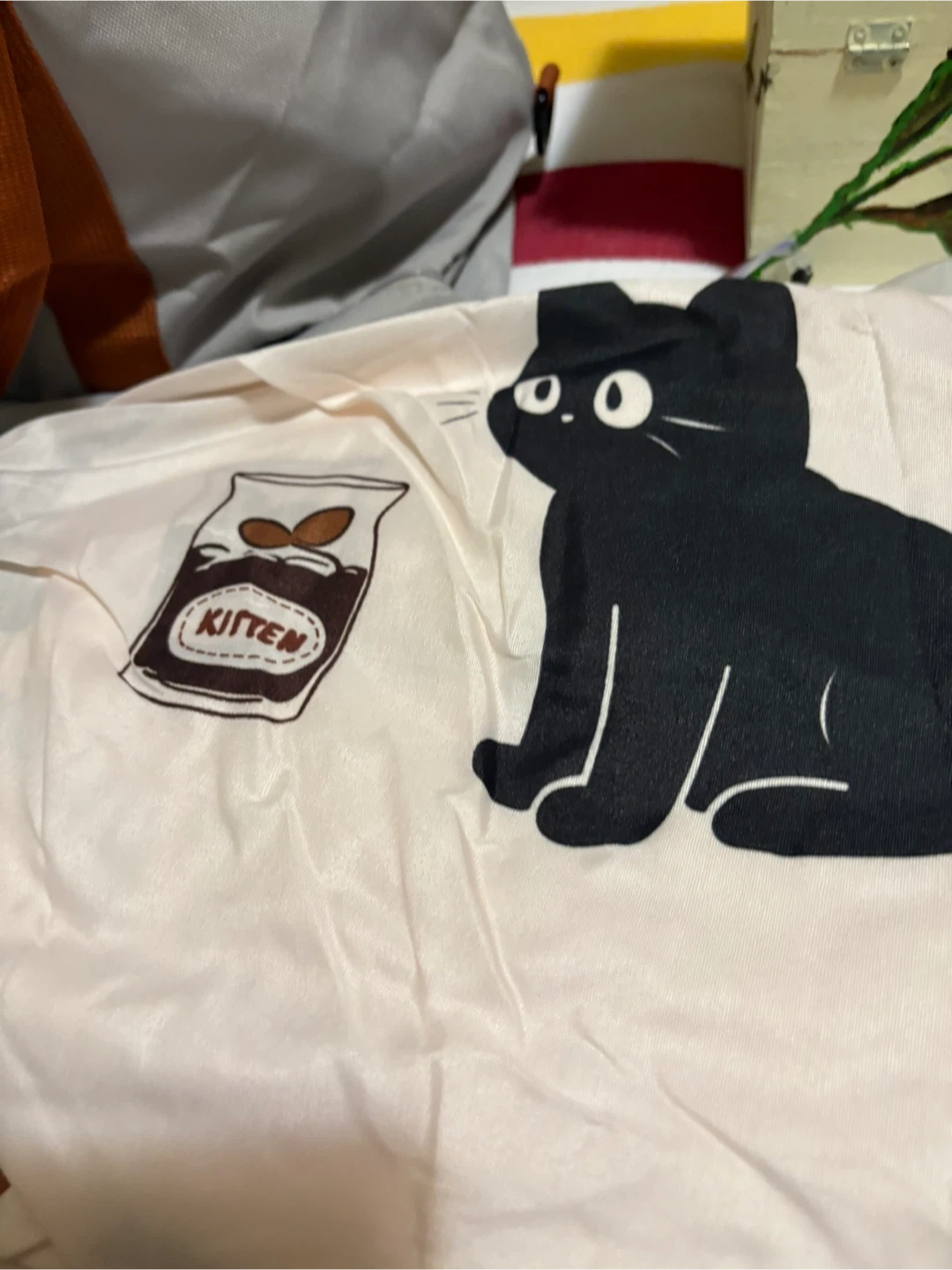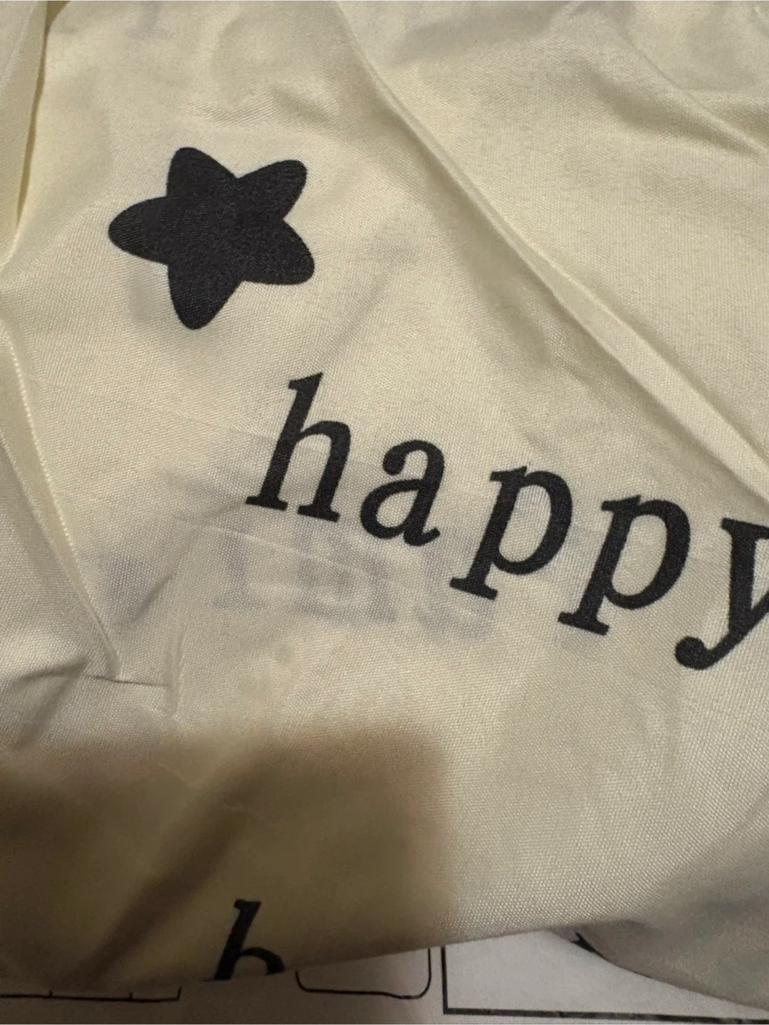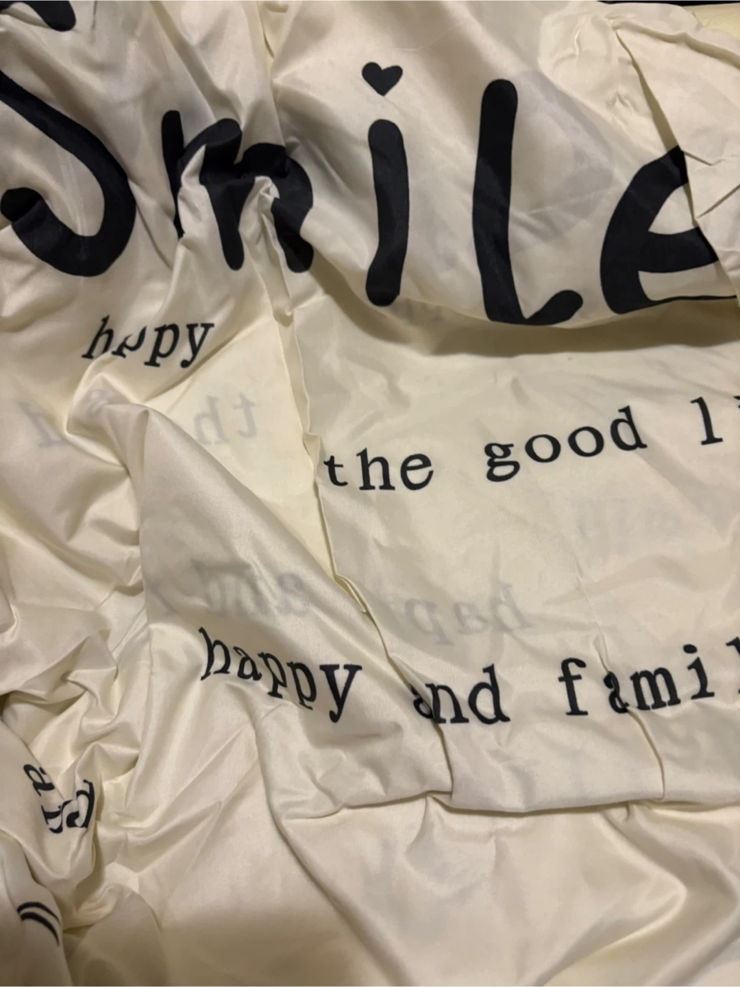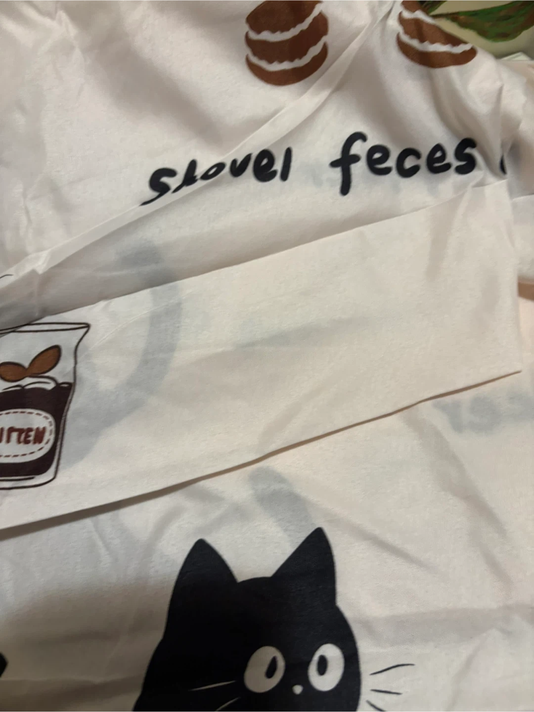 Here's a twin bed sheet with a fun pattern! It features images of cats, stars, and coffee cups. The words 'smile', 'happy', and 'the good life' are also printed on the sheet