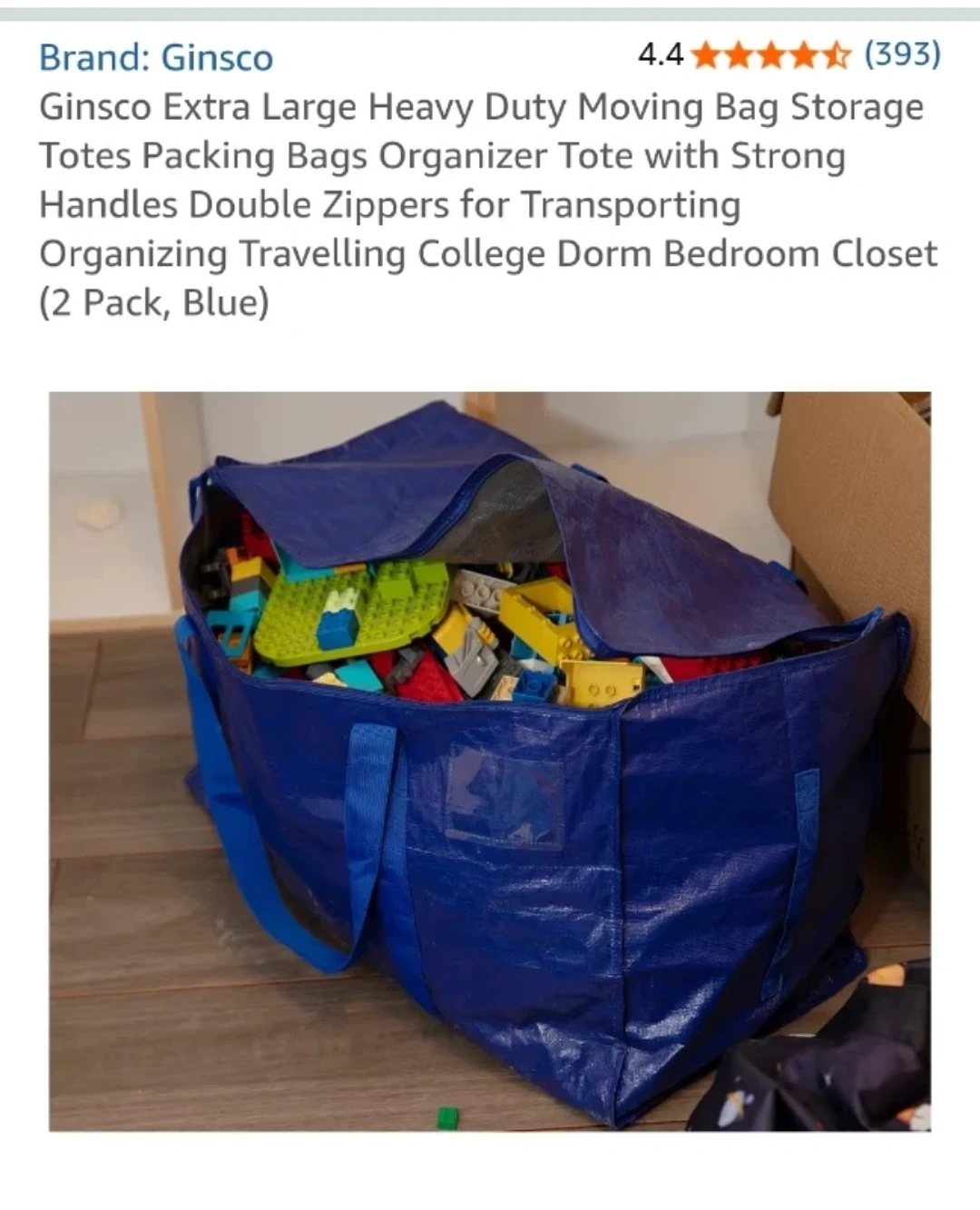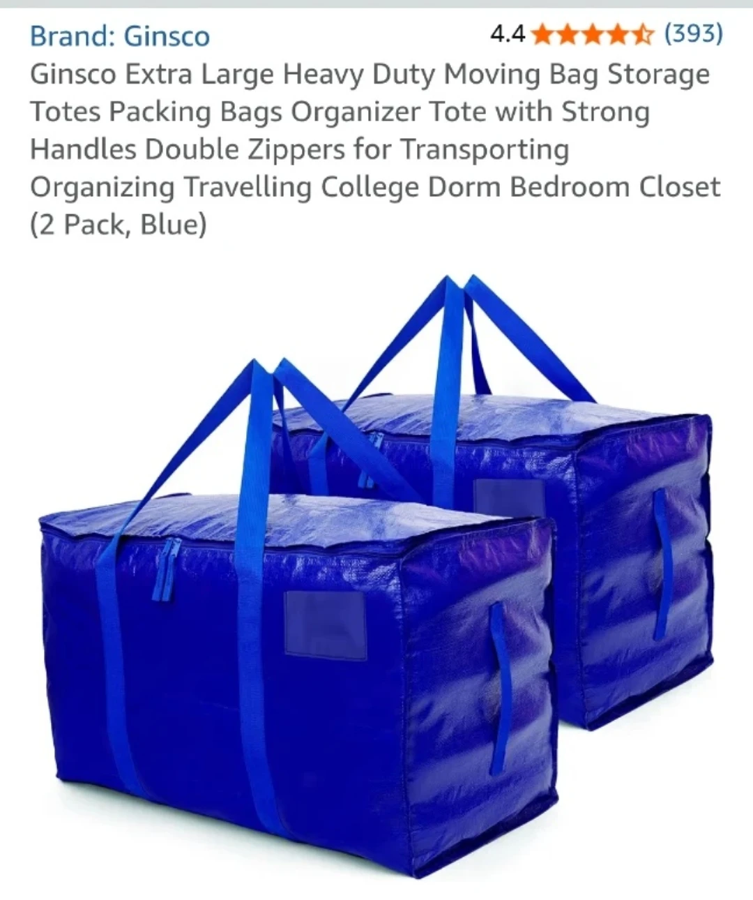 Selling a blue Ginsco extra-large heavy-duty moving bag. It's great for storage, packing, and organizing. The bag features strong handles and double zippers for easy transporting. Perfect for college dorms, bedrooms, and closets!