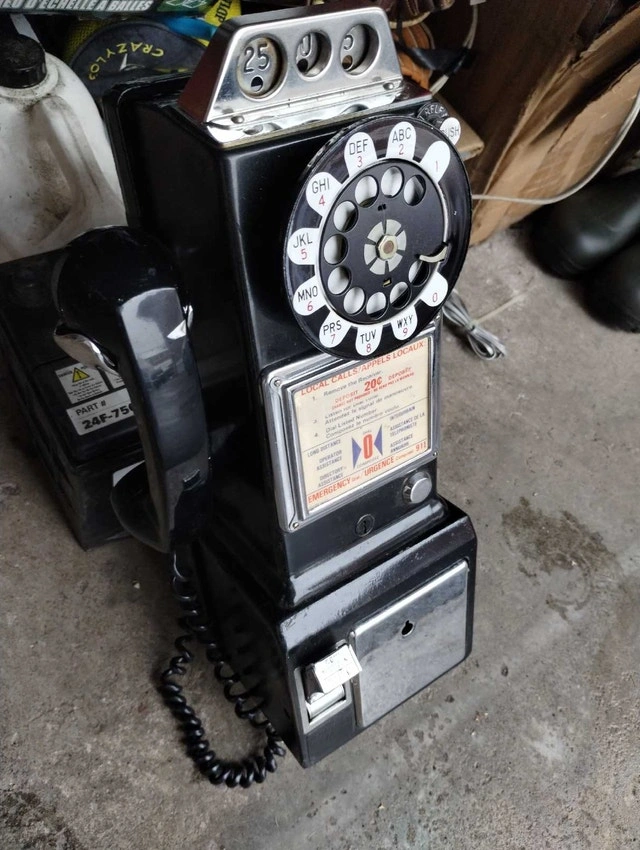 109Here is a vintage pay phone, a nostalgic piece of history ready to spark conversations and turn heads. This well-preserved, used pay phone is not just a decorative item; it's a conversation starter, perfect for adding a touch of retro charm to any space. This is not a new item, so please consider that when purchasing. Unfortunately, I am missing some of the specs on this cool phone, but here are the details I know: * Classic Design * Rotary Dial If you've been searching for something that blends vintage aesthetics with a dash of quirky fun, this pay phone might just be the ticket! If the ad is up, the phone is available!