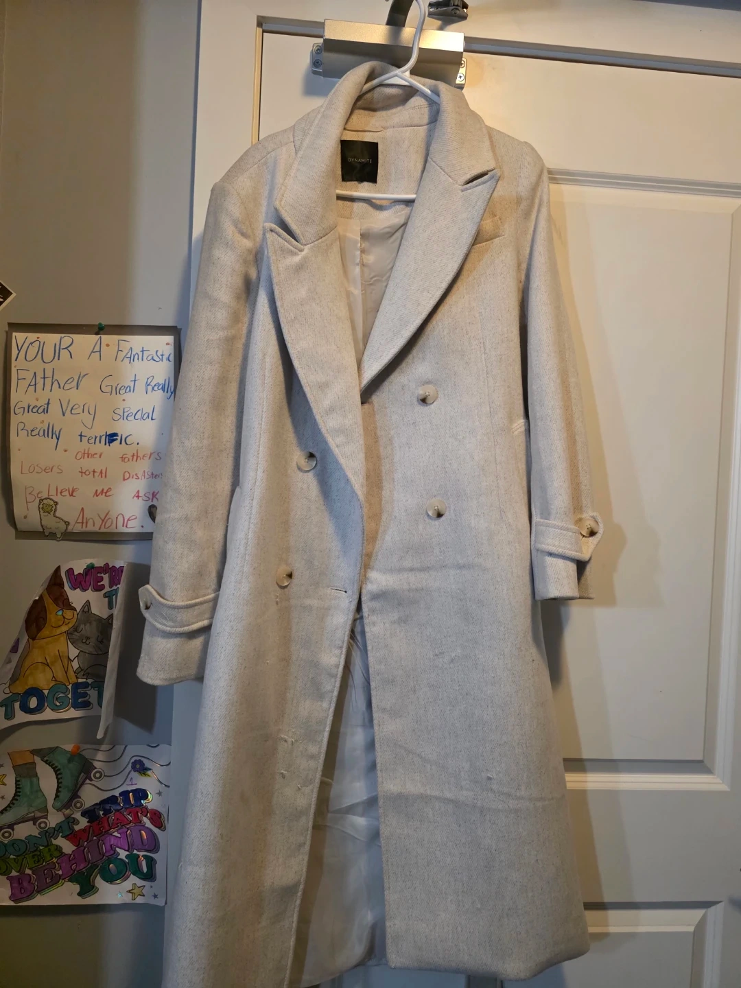 Selling a Dynamite belted coat in a light beige colour. It's a size medium and has a double-breasted design. There's a small tear in the lining on the inside, but otherwise it's in good condition! Been worn twice - its a little long for me