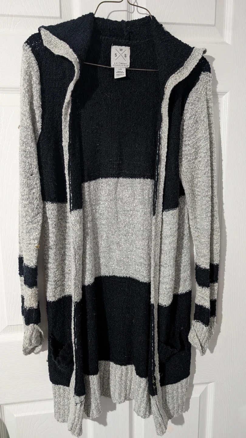 Cozy W by Suzy Shier knitwear cardigan in size L! Features a stylish black and grey striped pattern and a comfortable hooded design. Perfect for layering on chilly days!