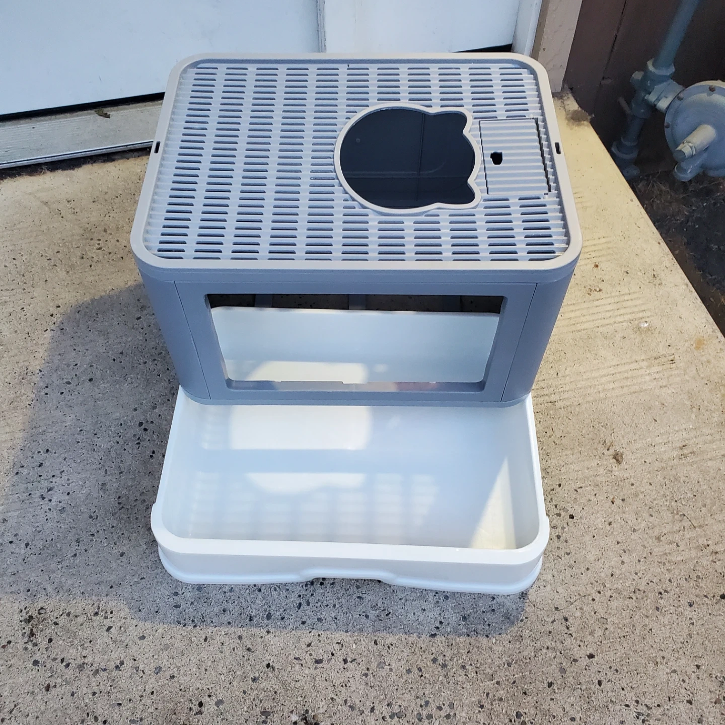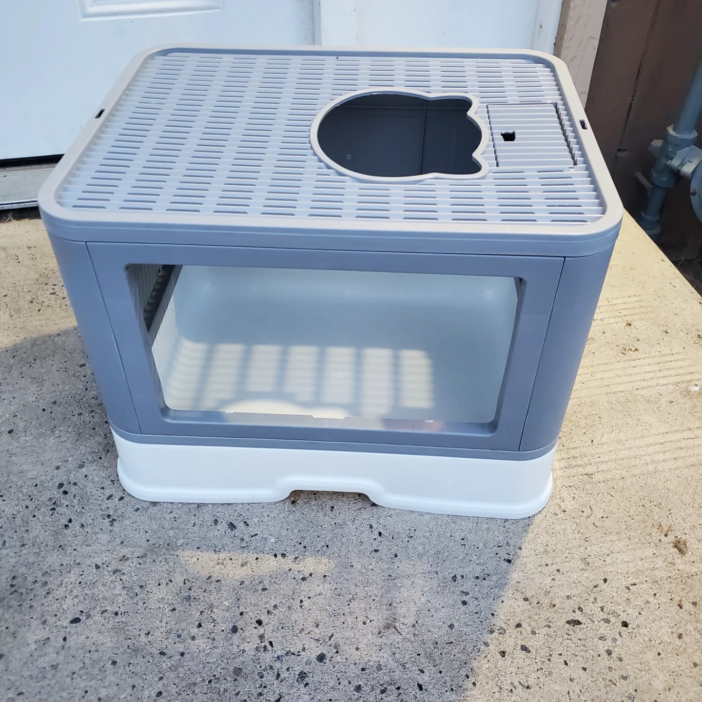 Selling a grey cat litter box with a top entry design. It's in great condition and ready for a new home for your feline friend! The box is a stylish grey and white colour. No door on front.