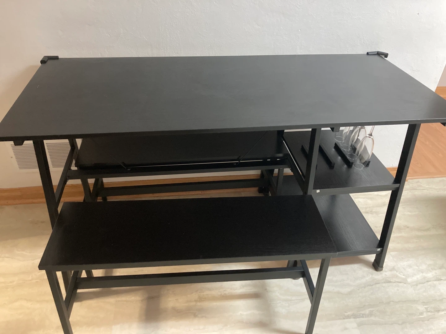 Selling rectangular black dining table with 2 benches and wine rack. good condition. no marks. good as new. good for