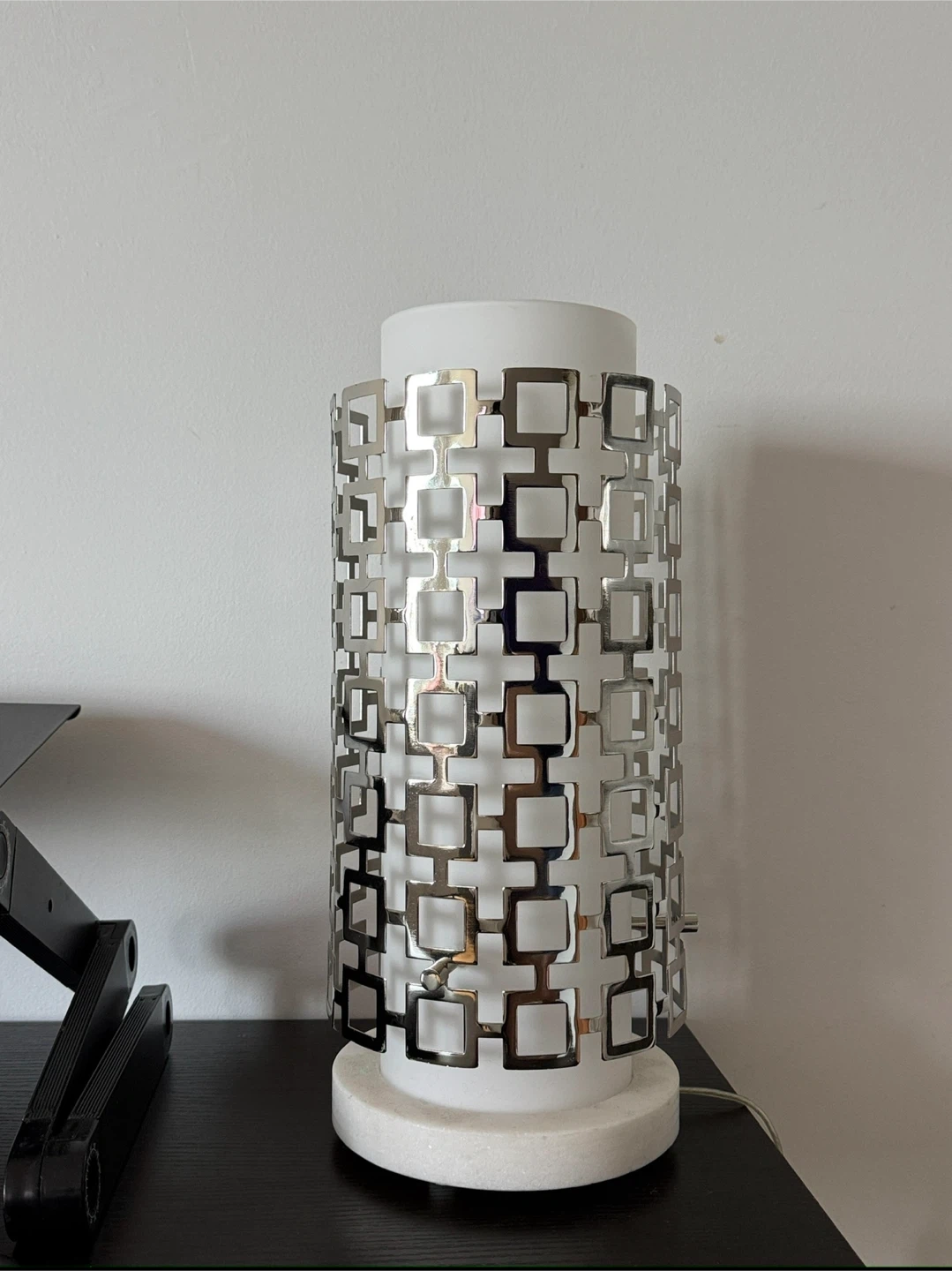 Selling a stylish table lamp featuring a geometric silver pattern that adds sophisticated oriental mood to the space. The lamp is in great condition and comes with its original power cord. You can control the brightness level with the slider.