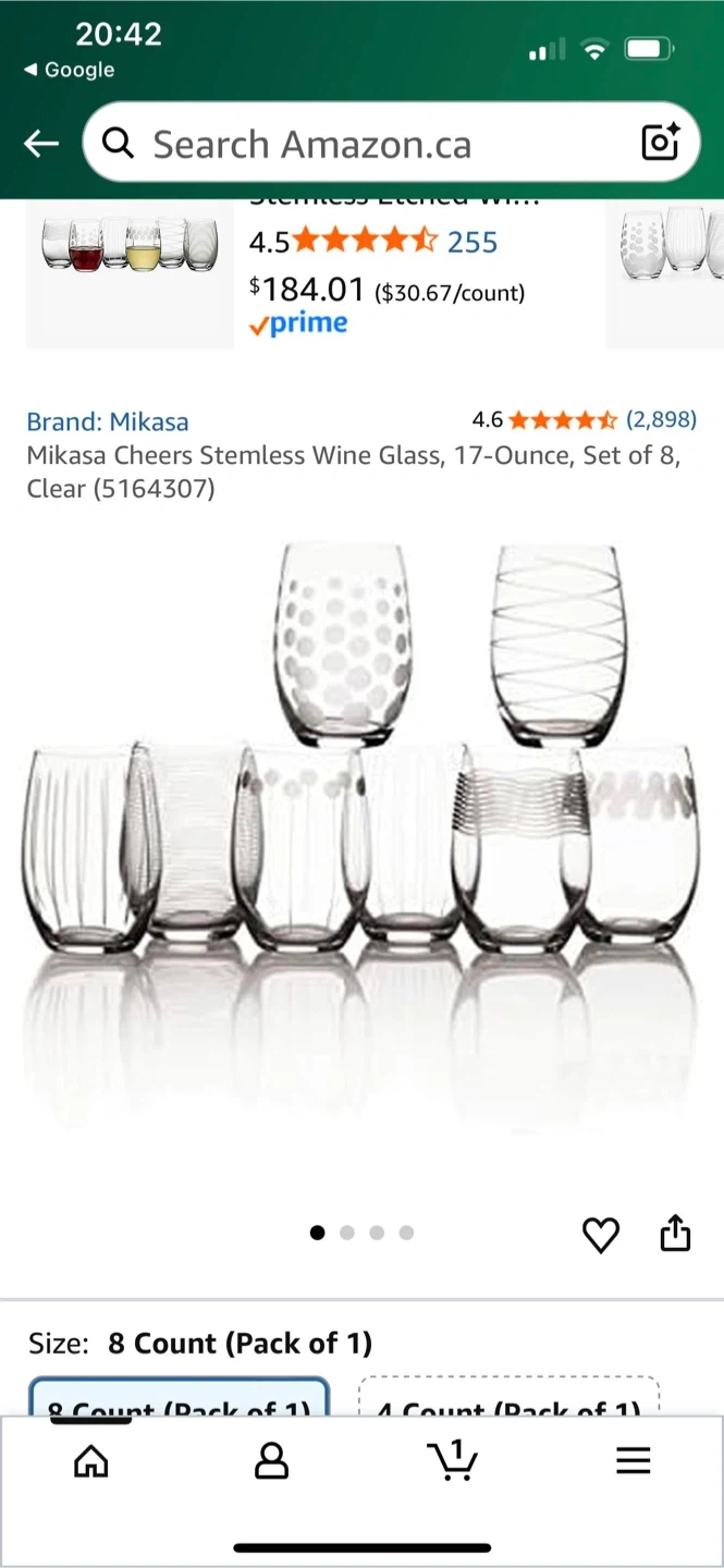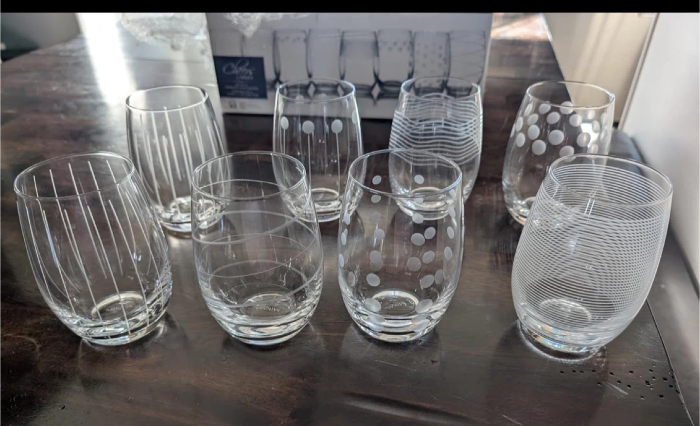 607Picture for display and I am selling brand new set with paper wraps. Selling a set of 8 Mikasa Cheers stemless wine glasses! Each glass has a unique etched design, making them perfect for parties or everyday use. They're 17-ounce glasses and in clear colour.