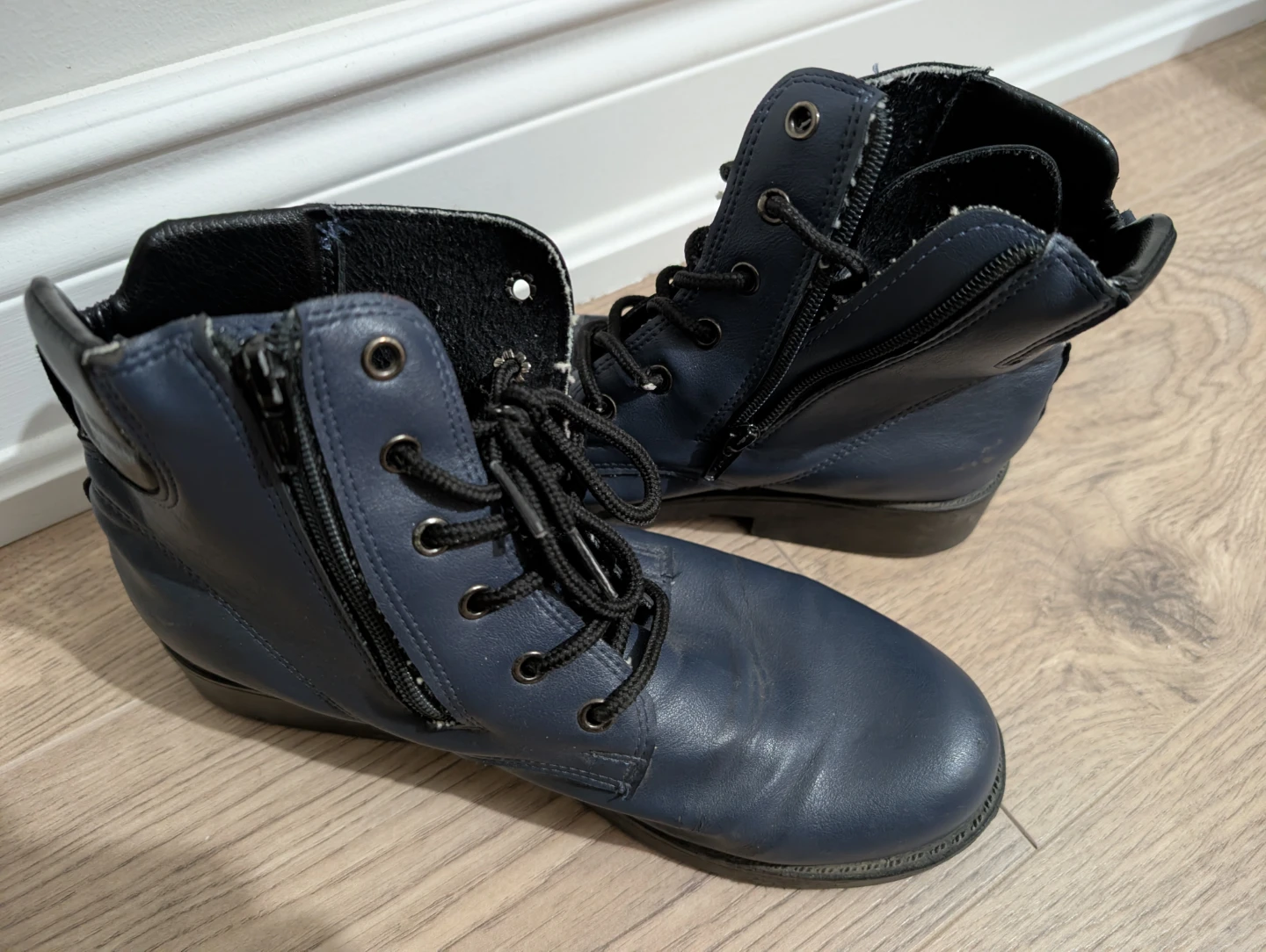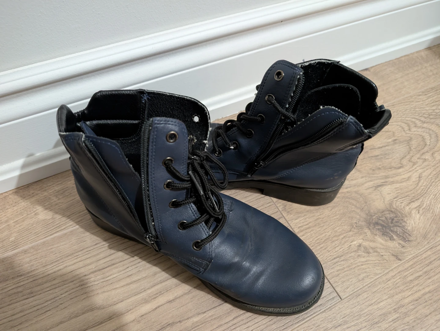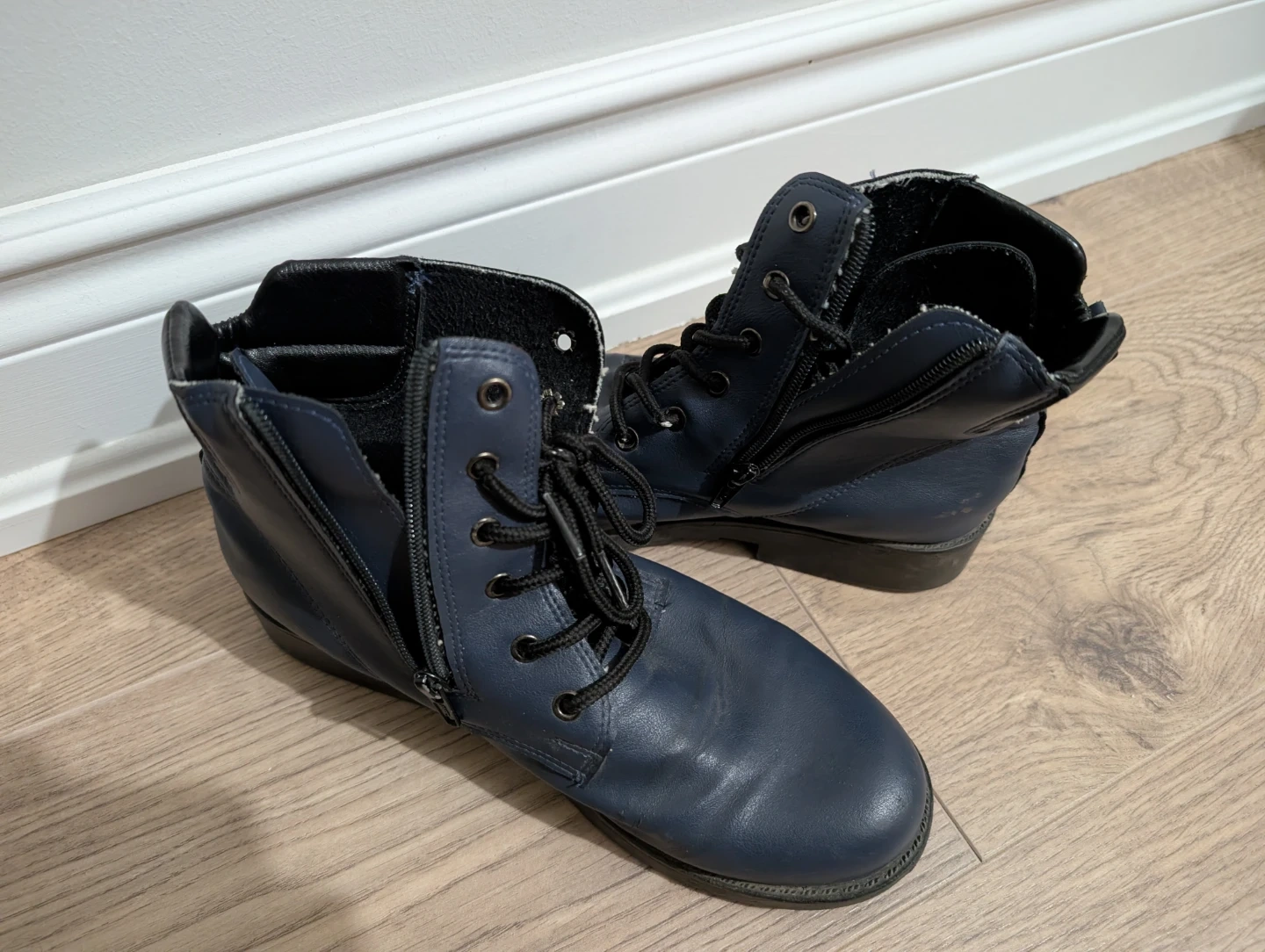 Selling a pair of blue ankle boots. They have a lace-up front and a zipper on the side. Synthetic leather. Good condition.