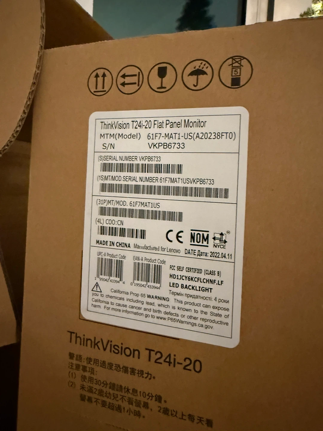 It’s a Lenovo ThinkVision T24i-20 flat panel monitor. Comes with its original box. The model number is 61F7-MAT1-US. It was manufactured in 2022.