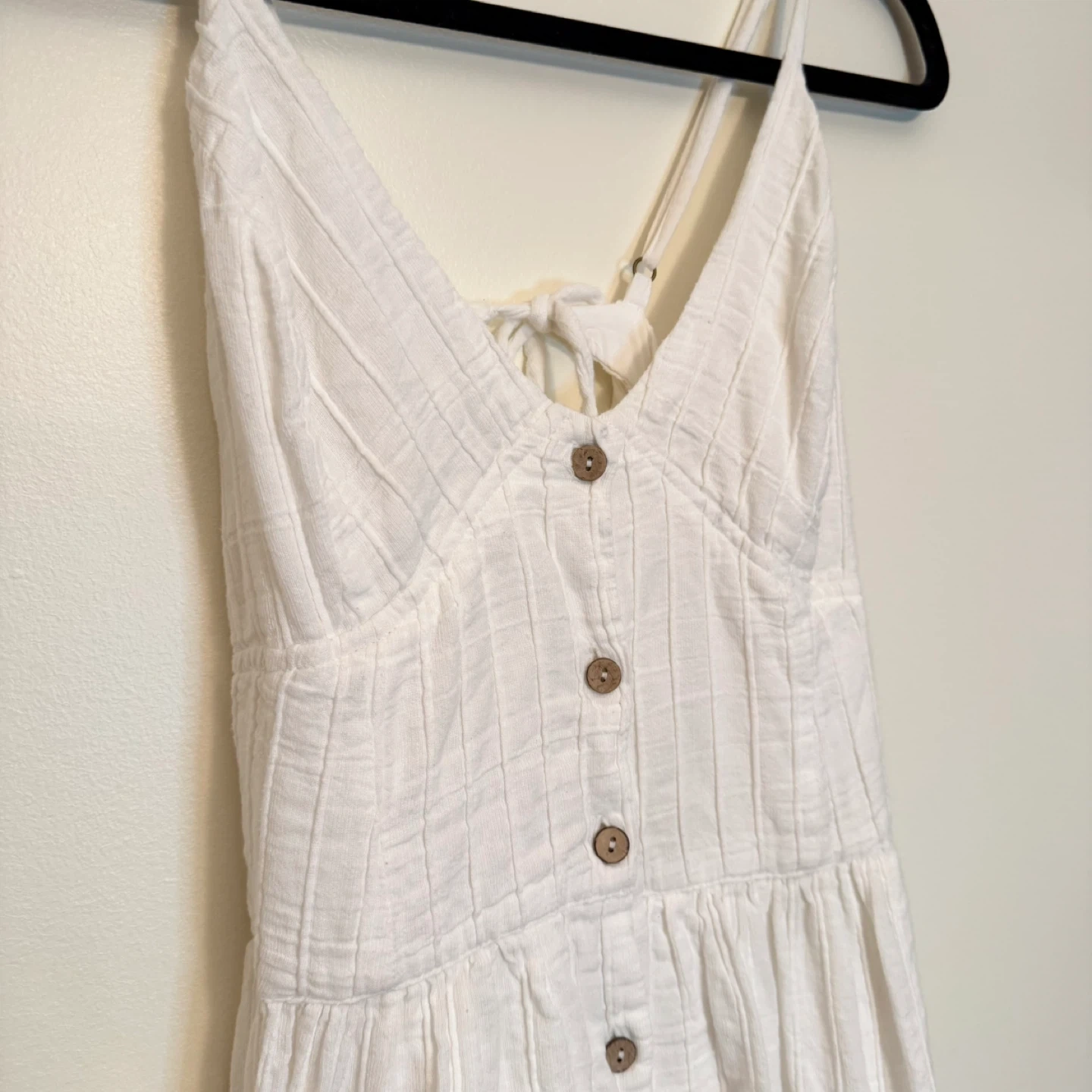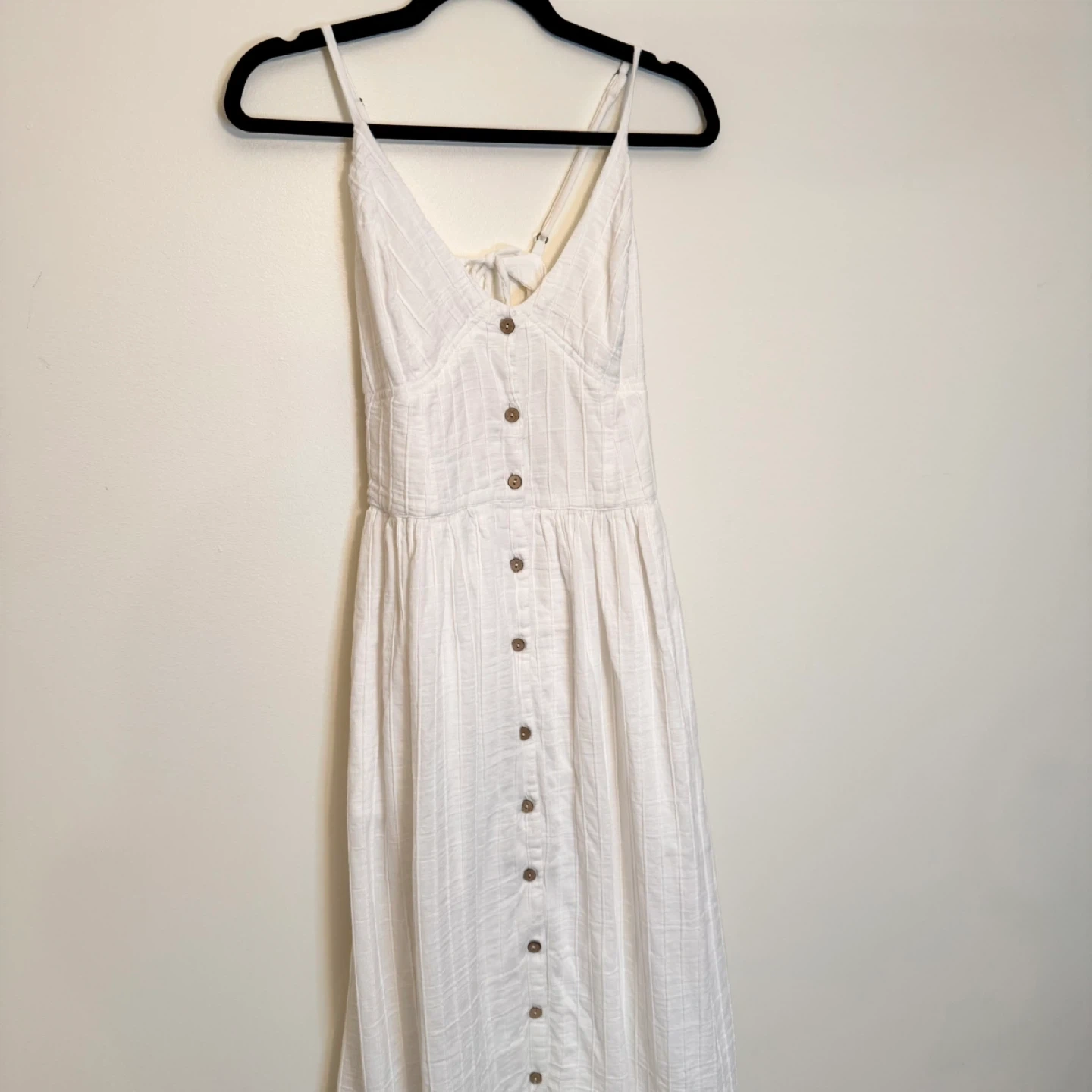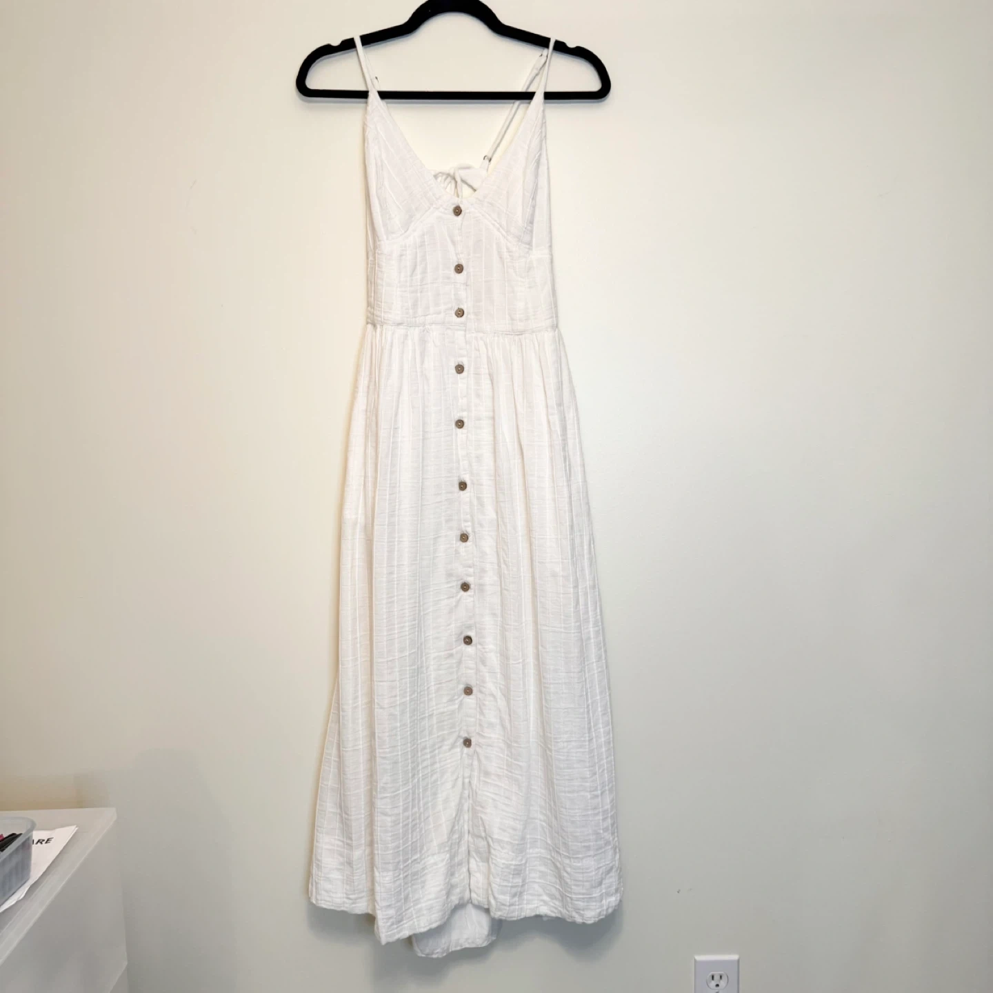 Free People textured button down white maxi dress. Fully lined. Size M in excellent condition. Has pockets and the straps are adjustable. It’s beautiful!