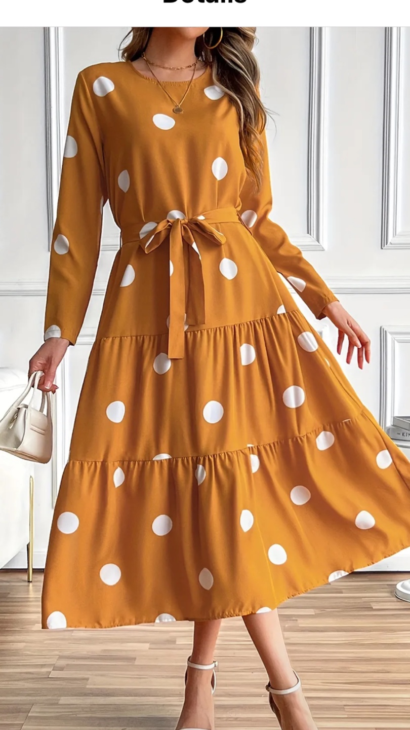 This is a super cute tiered long sleeve dress in a mustard yellow colour with white polka dots! It has a tie at the waist. Perfect for autumn days!