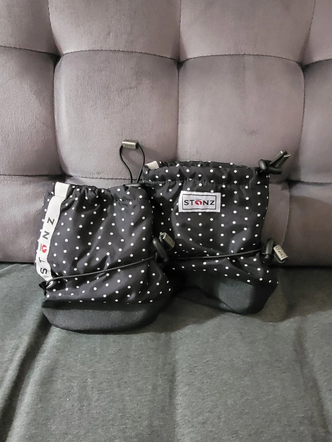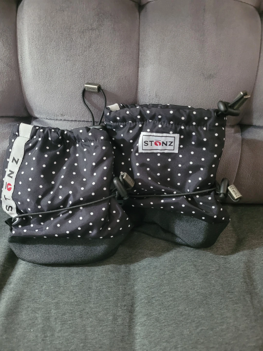These Stonz booties are in great condition! They're black with a cute polka dot pattern. The size is medium (like size5 or 6) —toddler size