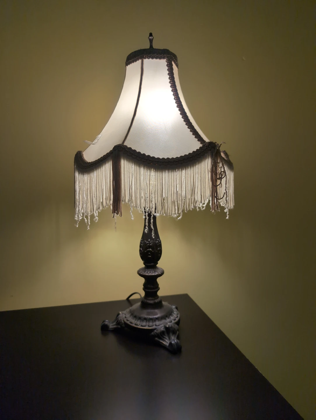 Selling a vintage-style table lamp. It features a decorative base and a fringed lampshade. It would be a great addition to any room!