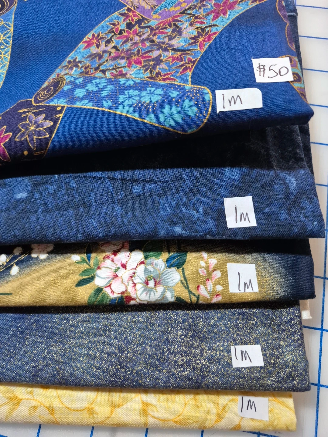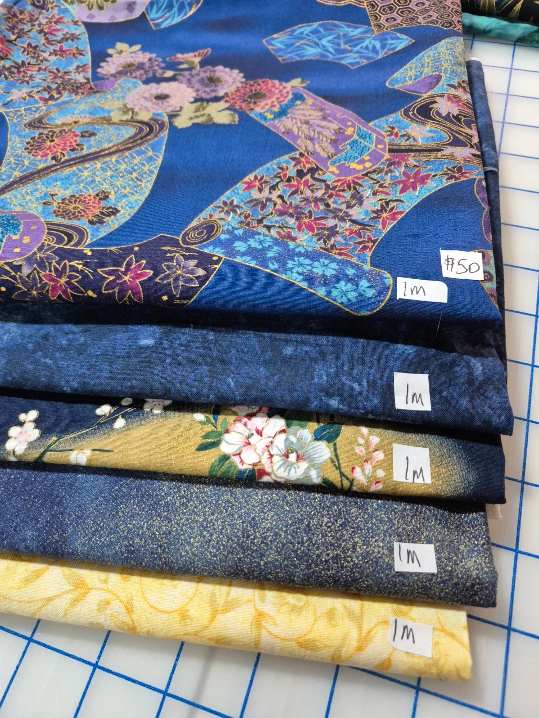 I have a collection of fabric pieces for sale! Each piece measures approximately 1 meter in length. They come in a variety of blue and yellow designs, including floral and geometric patterns. Perfect for your next sewing or crafting project
