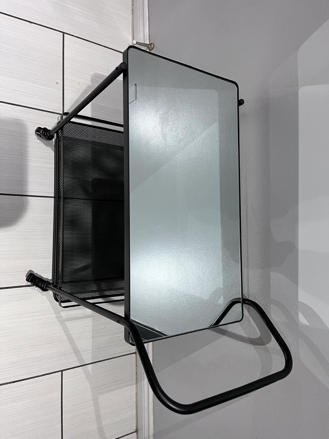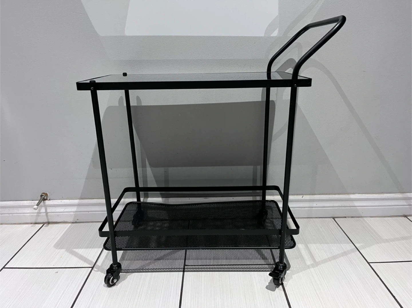 Black metal framed glass mirror top rolling cart. In great condition. There is a small dent in the bottom mesh rack. Very easy to maneuver as it’s lightweight and has wheels.