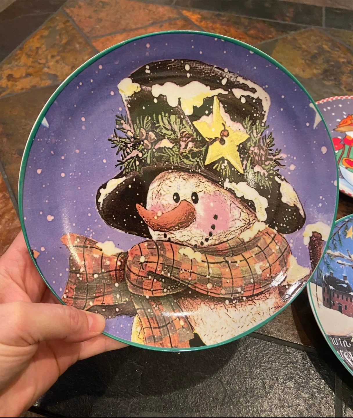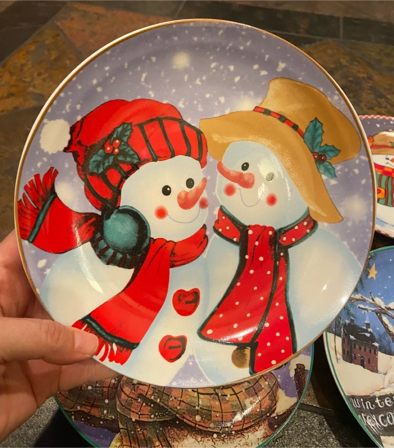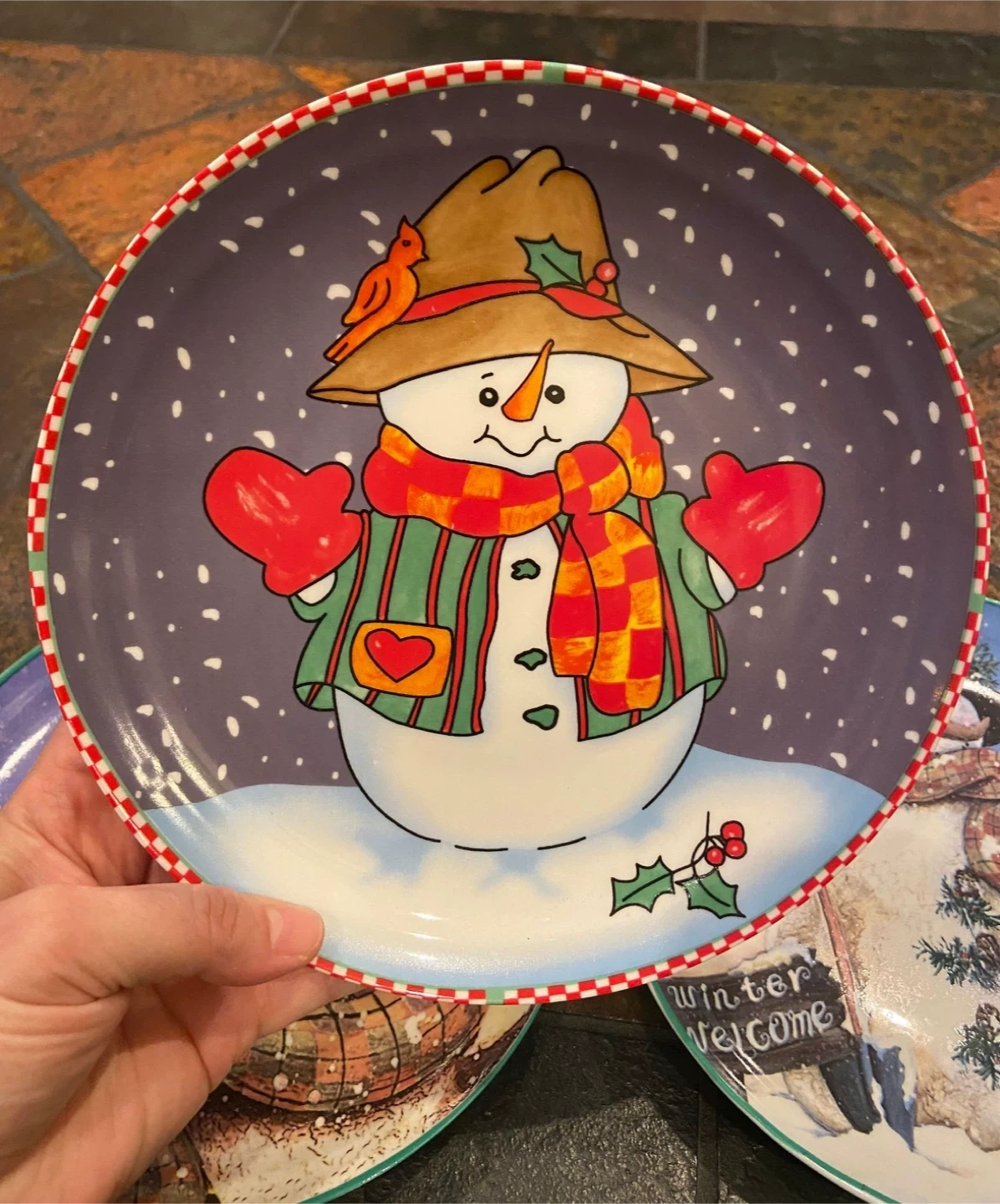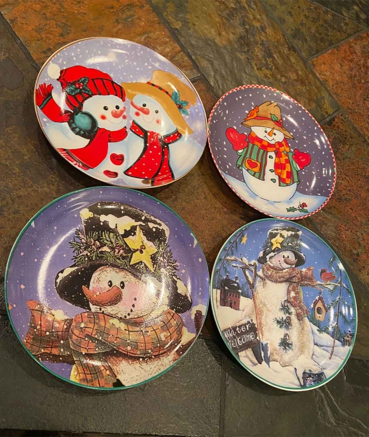 Selling a set of four decorative plates featuring different snowman designs!