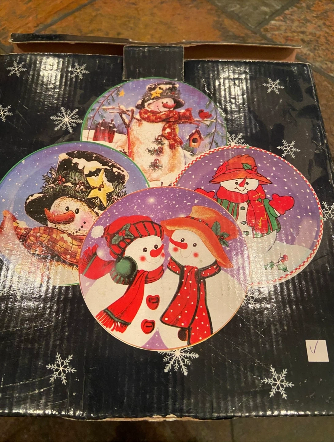 Selling a set of four decorative plates featuring different snowman designs!