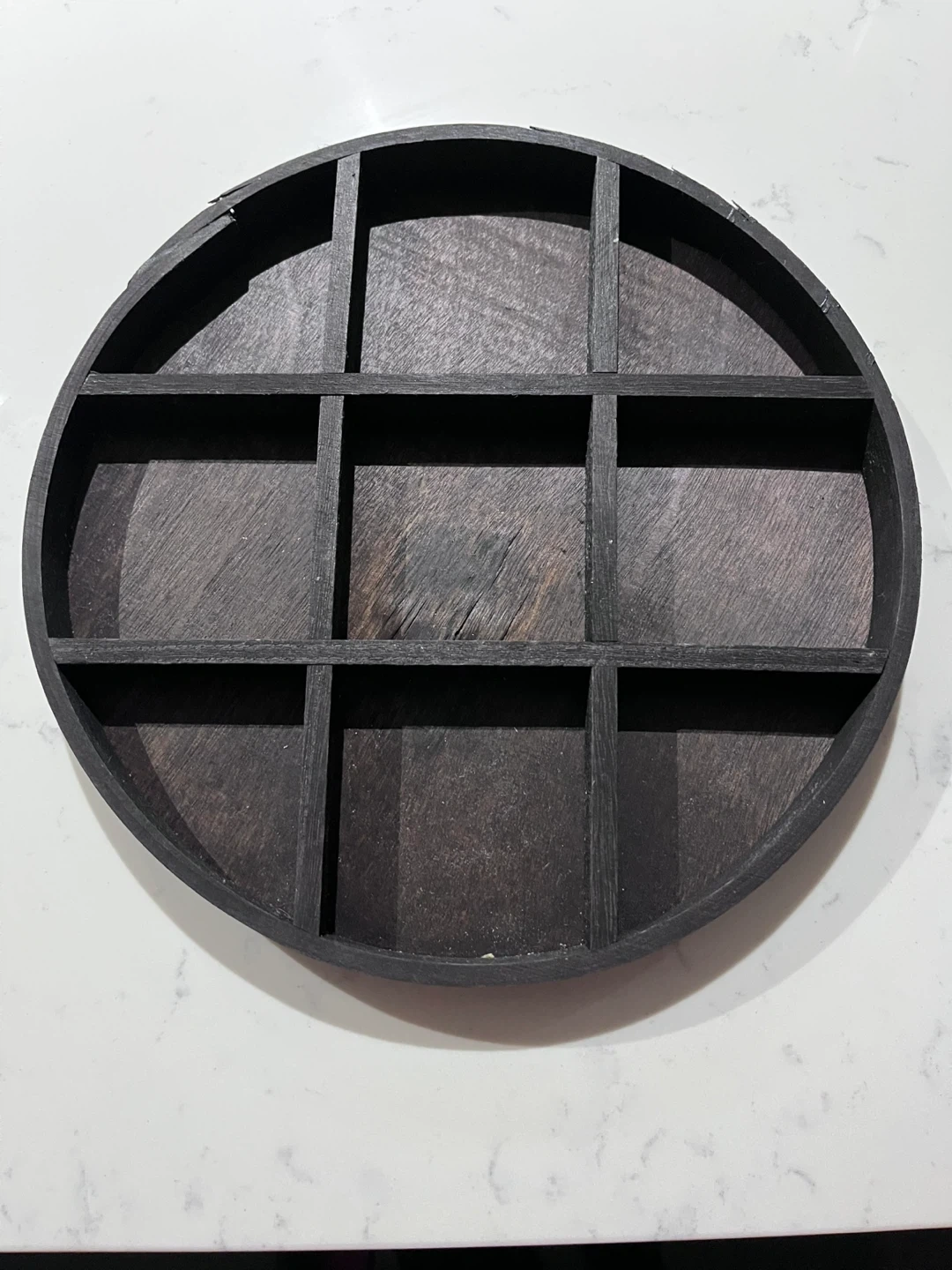 Selling a round wooden display box. It's in great condition and perfect for displaying small items or creating a unique wall decor piece. The shadow box is dark brown and has several compartments.