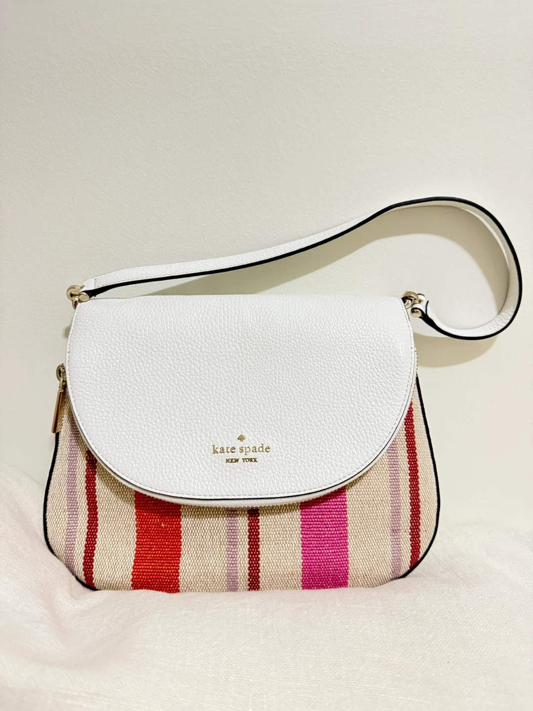 Selling a Kate Spade shoulder bag in great condition! The bag features a white top and a colourful striped bottom. It's a stylish and practical accessory for any outfit
