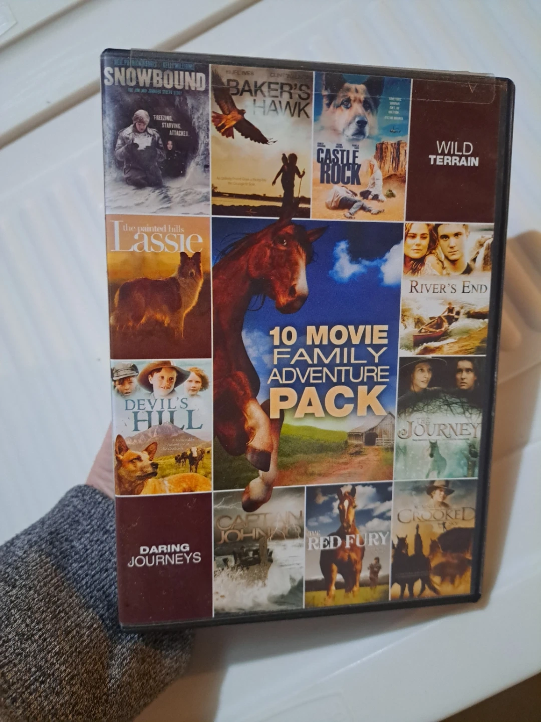 Selling a NEW unopened DVD pack with 10 family adventure movies. Titles include Snowbound, Baker's Hawk, Castle Rock, Wild Terrain, Lassie, Devil's Hill, River's End, The Journey, Captain John, Red Fury, Crooked and Daring Journeys