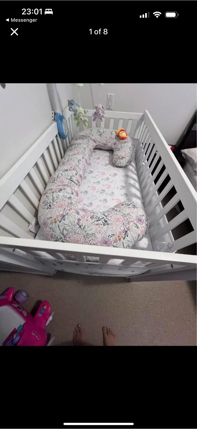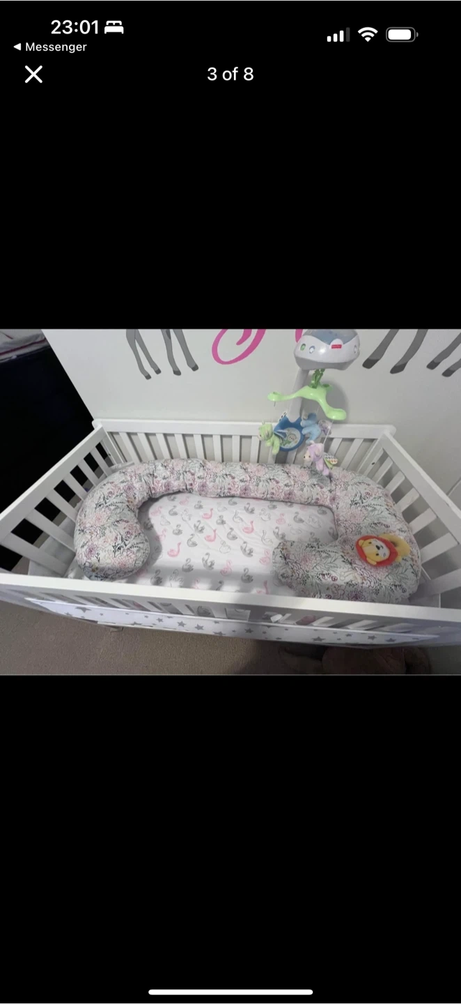 Selling a Chicco infant side sleeper pillow. It's designed to help your little one sleep comfortably and safely on their side. It has a cute floral pattern and a lion design on one end. Perfect for your baby's crib!