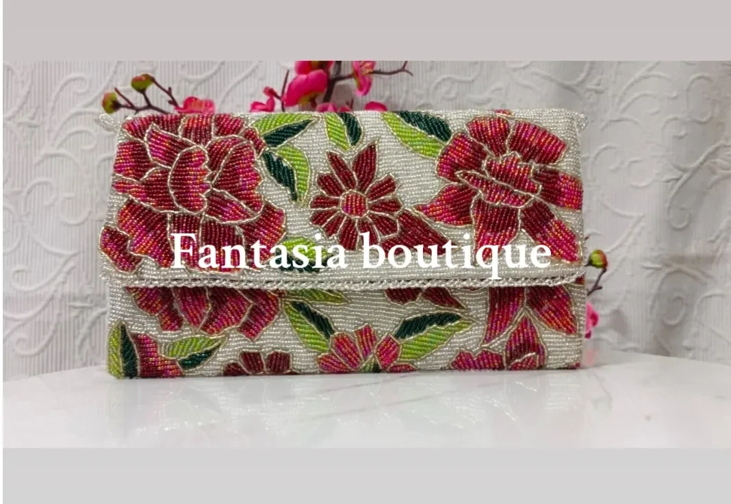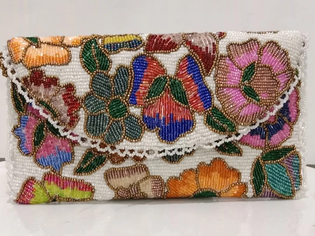 Check out this unique beaded clutch purse! It's got a beautiful floral design and is perfect for adding a pop of colour to any outfit. The intricate beadwork really makes it stand out!